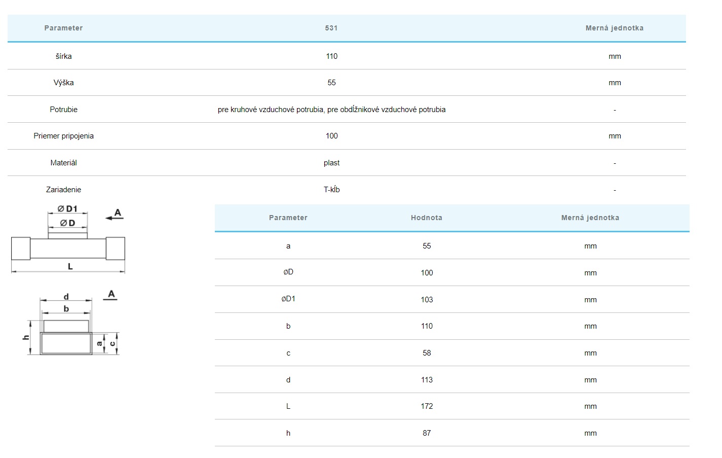 Plastová hranatá rozbočka 55x110mm sa pripája k hranatému potrubiu nasunutím potrubia do rozbočky 55x110mm a kruhové potrubie sa pripája pomocou spojky kód 111 na kruhové potrubie Ø 100mm.