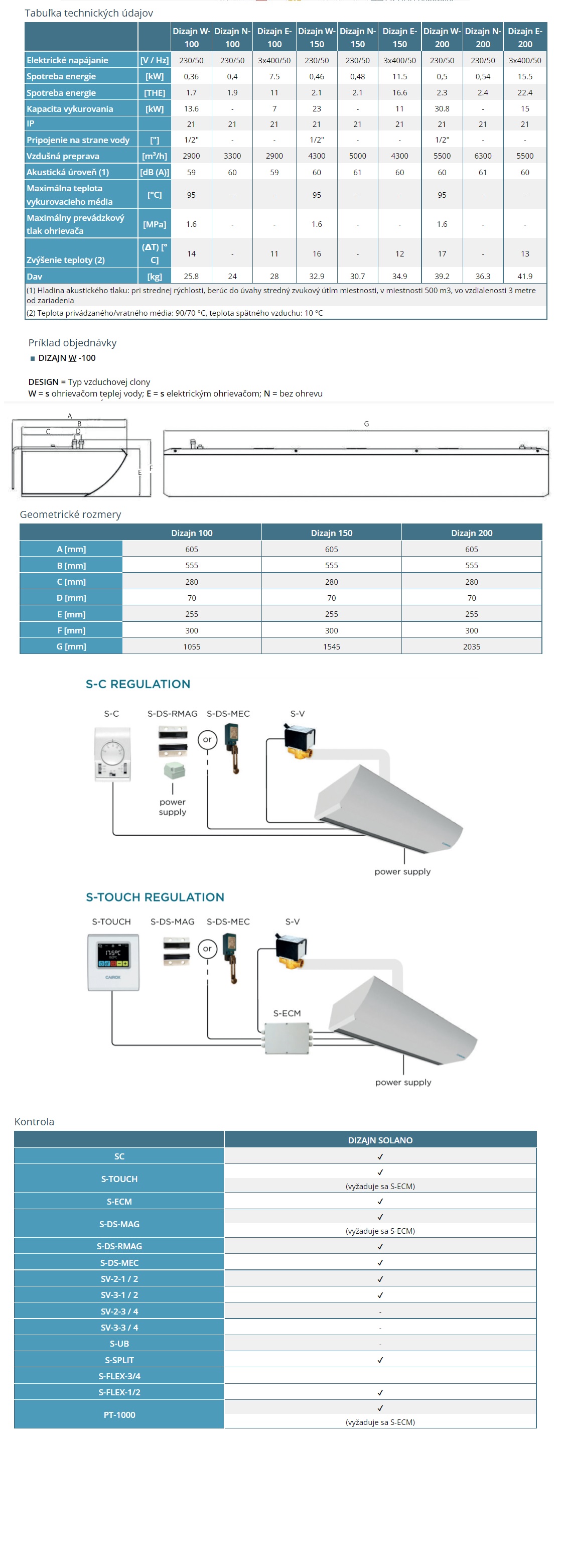 Pre kancelárske budovy a priemyselné zariadenia, kde je očakávaný čistý dizajn. Vzduchové clony SOLANO DESIGN sú navrhnuté horizontálne na inštaláciu priamo nad dvere (do výšky 5 metrov).Technické špecifikácie