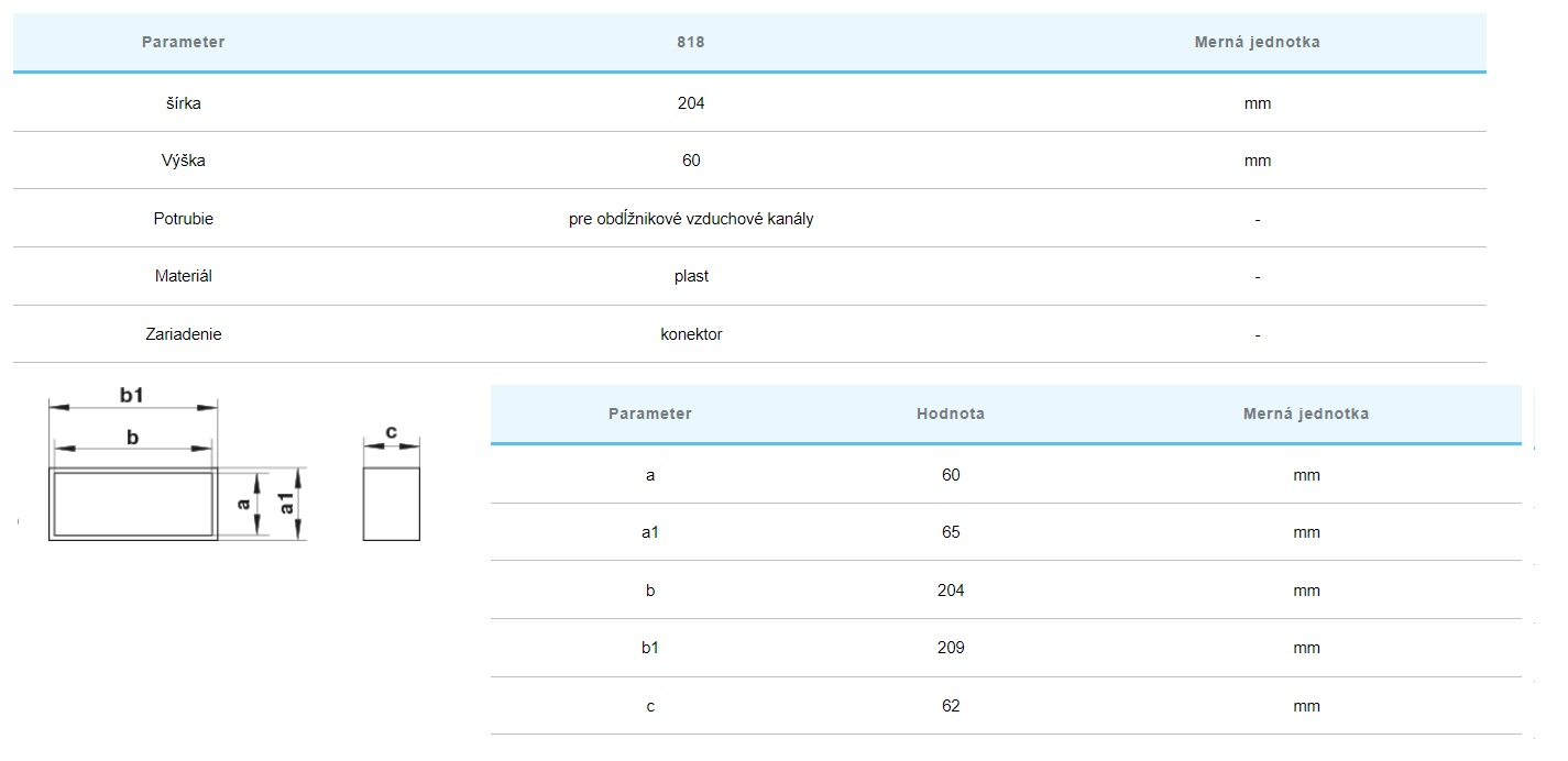 Vzduchotechnická plastová  spojka vonkajšia k hranatým potrubiam 60x204mm.Spojenie s potrubím sa vykonáva nasunutím potrubia do spojky .Konštrukcia.Vyrobené z bieleho plastu.Určené pre priamu