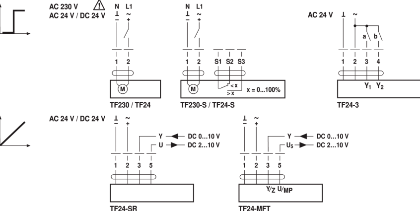 - Regulácia: kontinuálny, štandardný riadiaci signál DC 0-10V, polohová spätná väzba DC 2-10V. Namerané napätie U umožňuje nastavenie polohy uzávierky (0-100%) na elektrický signál a poskytuje kontrolný signál ostatným motorom.