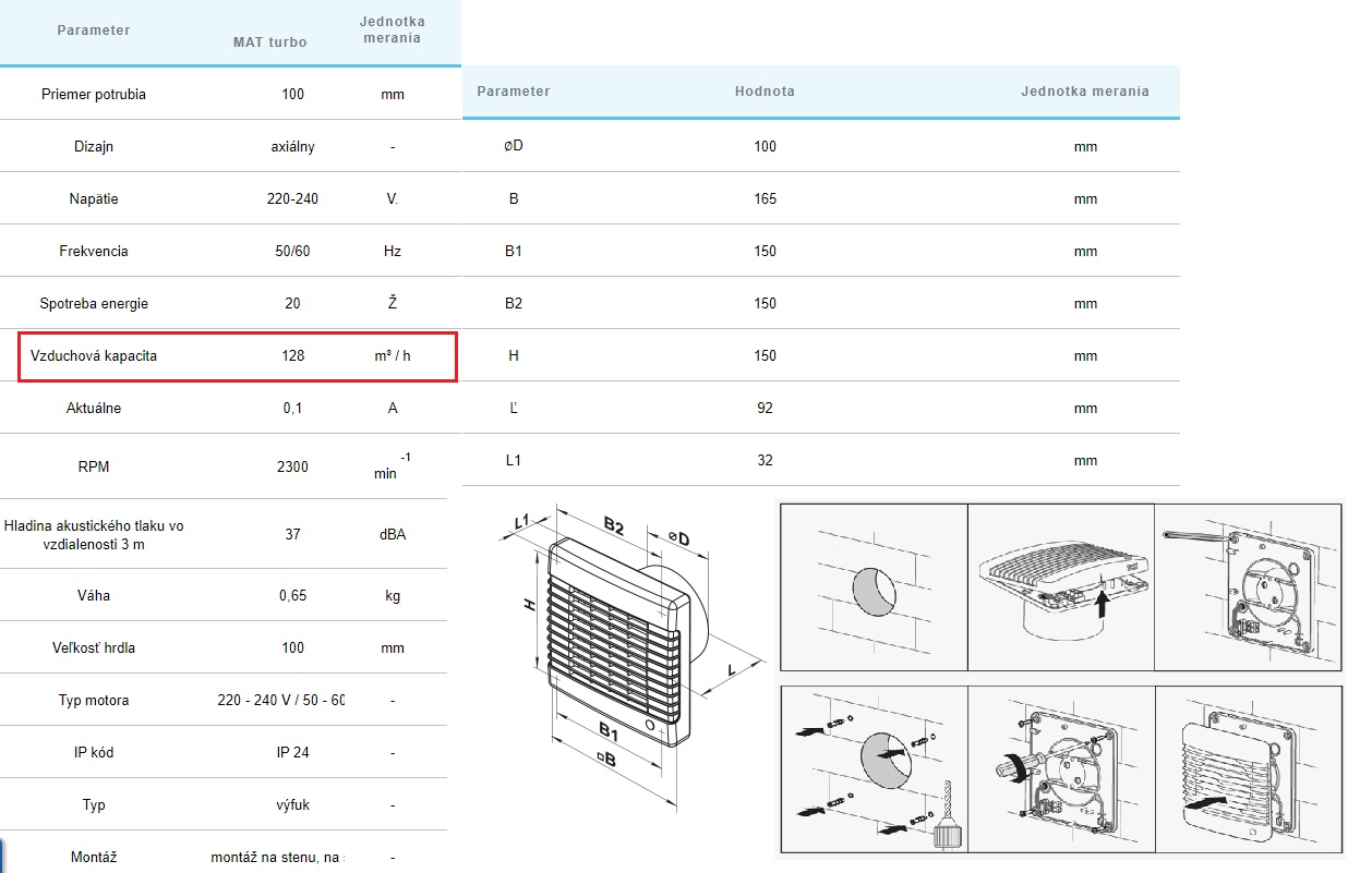 Ventilátor do kúpeľne a WC pre 100mm potrubie výkon 128m3/h-automatická žaluzia.T Ventilátor je vybavený časovačom .Po vypnutí vypínača ventilátor pokračuje v činnosti v lehote od 2 až do 30 minút v závislosti na nastavení časovača. Časovač /timer/ sa nastavuje otáčaním potenciometra v smere hodinových ručičiek pre zvýšenie a proti smeru hodinových ručičiek pre jej zníženie.Turbo zvýšený výkon