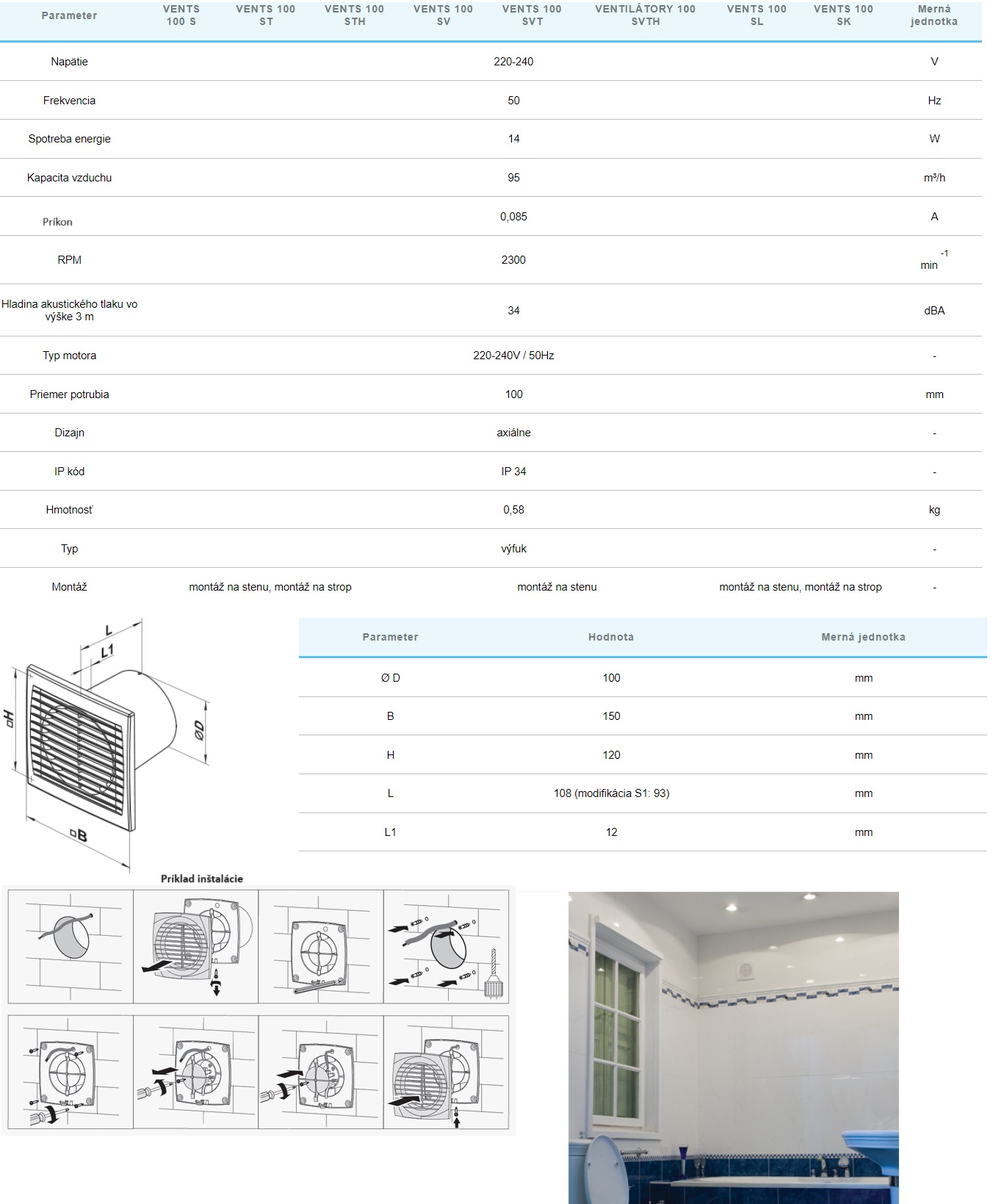 Výbava:Označenie TH Ventilátor je vybavený časovačom a čidlom vlhkosti .Čidlo vlhkosti je nastaviteľné v koncentrácíí z ~ 60% na ~ 90%. Ak úroveň vlhkosti H klesne pod nastavenú hranicu ventilátor pokračuje v činnosti v lehote od 2 až do 30 minút v závislosti na nastavení na časovači /timer/ Otáčaním ovládacieho gombíka jednotlivých potenciometrov pre / časovač T a H pre snímač vlhkosti/ v smere hodinových ručičiek pre zvýšenie a proti smeru hodinových ručičiek pre zníženie nastavenej hodnoty.Ventilátory do kúpeľne a wc sú určené na nepretržité alebo periodické odsávanie kúpeľní, spŕch, kuchýň a iných úžitkových priestorov. Montáž ventilačnej šachty alebo pripojenie potrubia. Pohyb nízkeho až stredného prúdu vzduchu na krátke vzdialenosti pri nízkom odpore vzduchu. Kompatibilné so vzduchovými kanálmi Ø 100 mm. DIZAJN Moderný dizajn a estetický vzhľad. Plášť a obežné koleso sú vyrobené z kvalitného odolného ABS plastu, odolného voči UV žiareniu. Intelektuálny dizajn obežného kolesa zvyšuje účinnosť ventilátora a dlhú životnosť. Ultra tenký predný panel. Sieťka proti hmyzu. Krytie IP34. MOTOR Spoľahlivý a nízkowattový elektromotor. Navrhnuté pre nepretržitú prevádzku a nevyžaduje žiadnu údržbu. Vybavené ochranou proti prehriatiu. KONTROLA Manuálny: Ventilátory do kúpeľne a w je ovládaný vypínačom osvetlenia v miestnosti. Nie je súčasťou dodávky. . Neaplikuje sa v prípade montáže na strop. Regulácia otáčok je možná pomocou tyristorového regulátora otáčok (pozri Elektrické príslušenstvo ). K tomu istému ovládaču môže byť pripojených niekoľko ventilátorov. Regulátory otáčok nie je možné pripojiť k ventilátorom s modifikáciou T , TH , TP , VT , VTH . automaticky: Prostredníctvom elektronickej riadiacej jednotky BU-1-60 . Riadiaca jednotka je dodávaná samostatne. MONTÁŽNE VLASTNOSTI Ventilátor sa montuje priamo do ventilačnej šachty. V prípade vzdialeného umiestnenia ventilačnej šachty sa odporúča aplikácia flexibilného potrubia. Vzduchové potrubie je pripojené k výfukovej prírube ventilátora cez svorku. Upevnené na stenu samoreznými skrutkami. Vhodné pre montáž na strop.