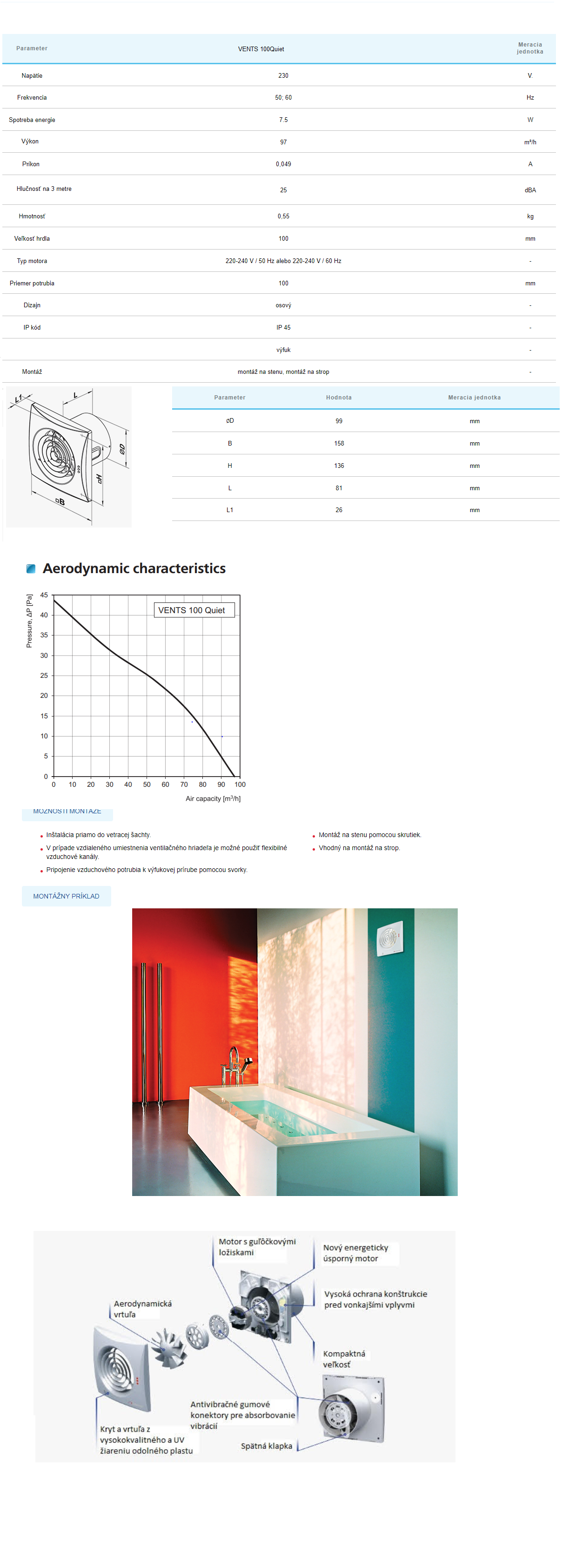 a zvýšenie tlaku vzduchu a zníženie úrovne hluku.Vysoké Krytie IP 45 zabezpečuje že ventilátor je ideálnym riešením pre vetranie kúpeľne. Elektronické komponenty sú chránené pevnými krytmi.