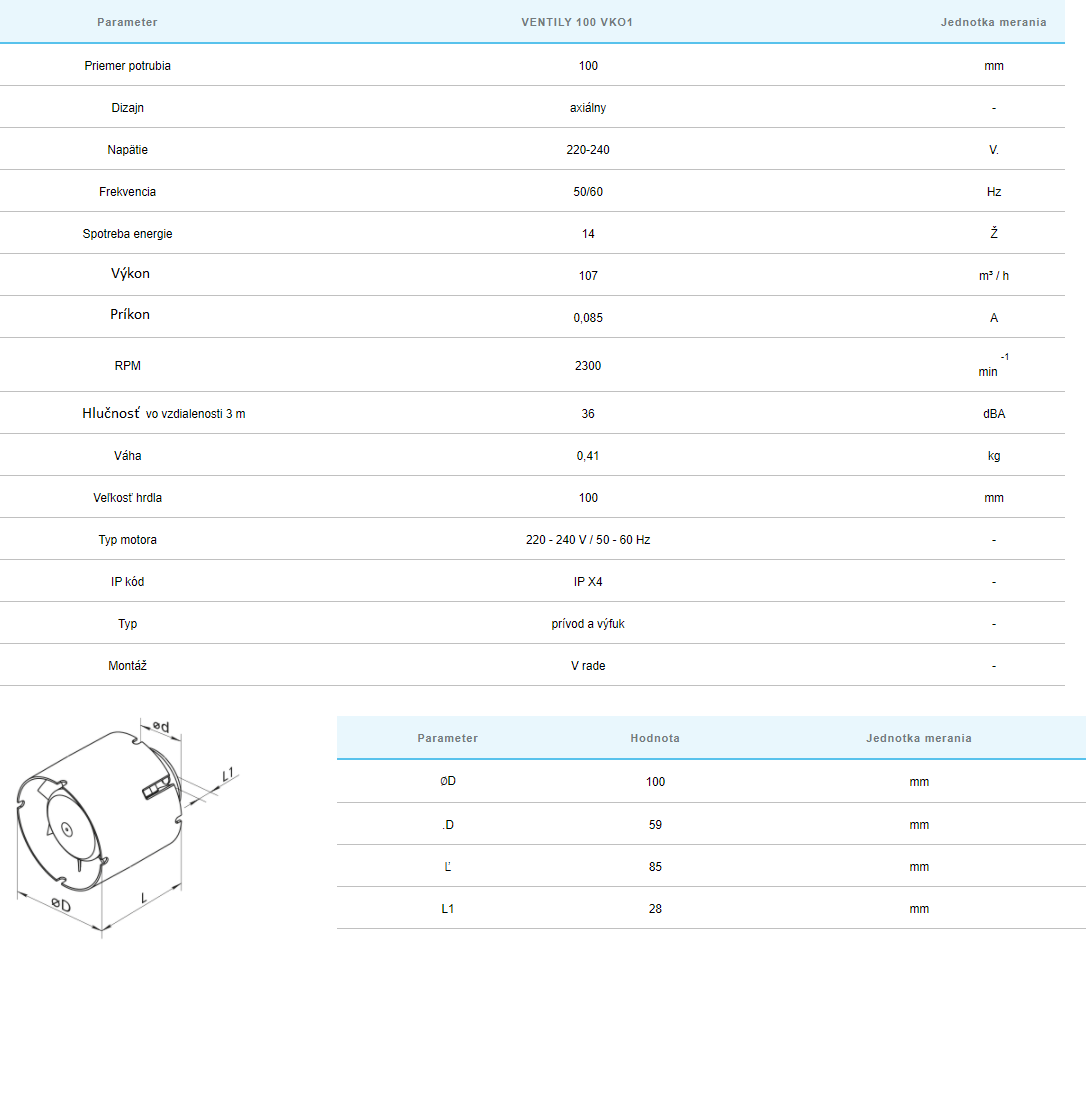 Potrubný ventilátor výkon:107 m3 do potrubia 100mm VENTS 100VKO1-riadenie vypínačom na svetlo.