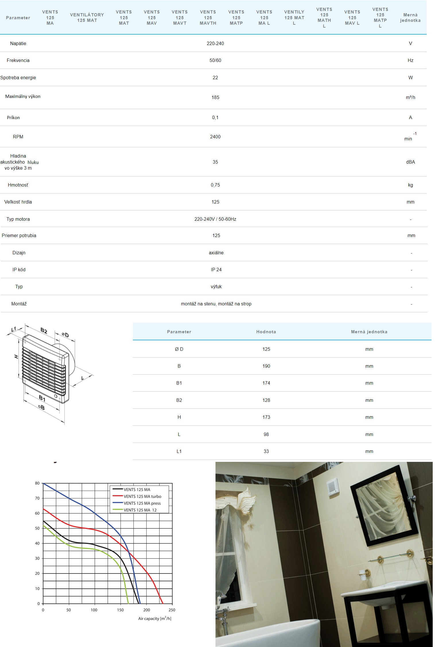 Kompatibilné so vzduchovými kanálmi 125 mm.Ventilátor do kúpeľne a WC