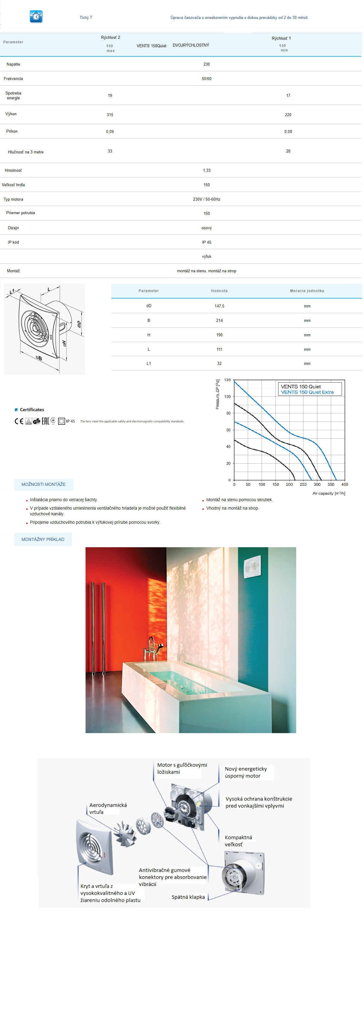 Motor vybavený ochranou proti prehriatiu. Ventilátor 150 QUIET s 2-stupňovým motorom.