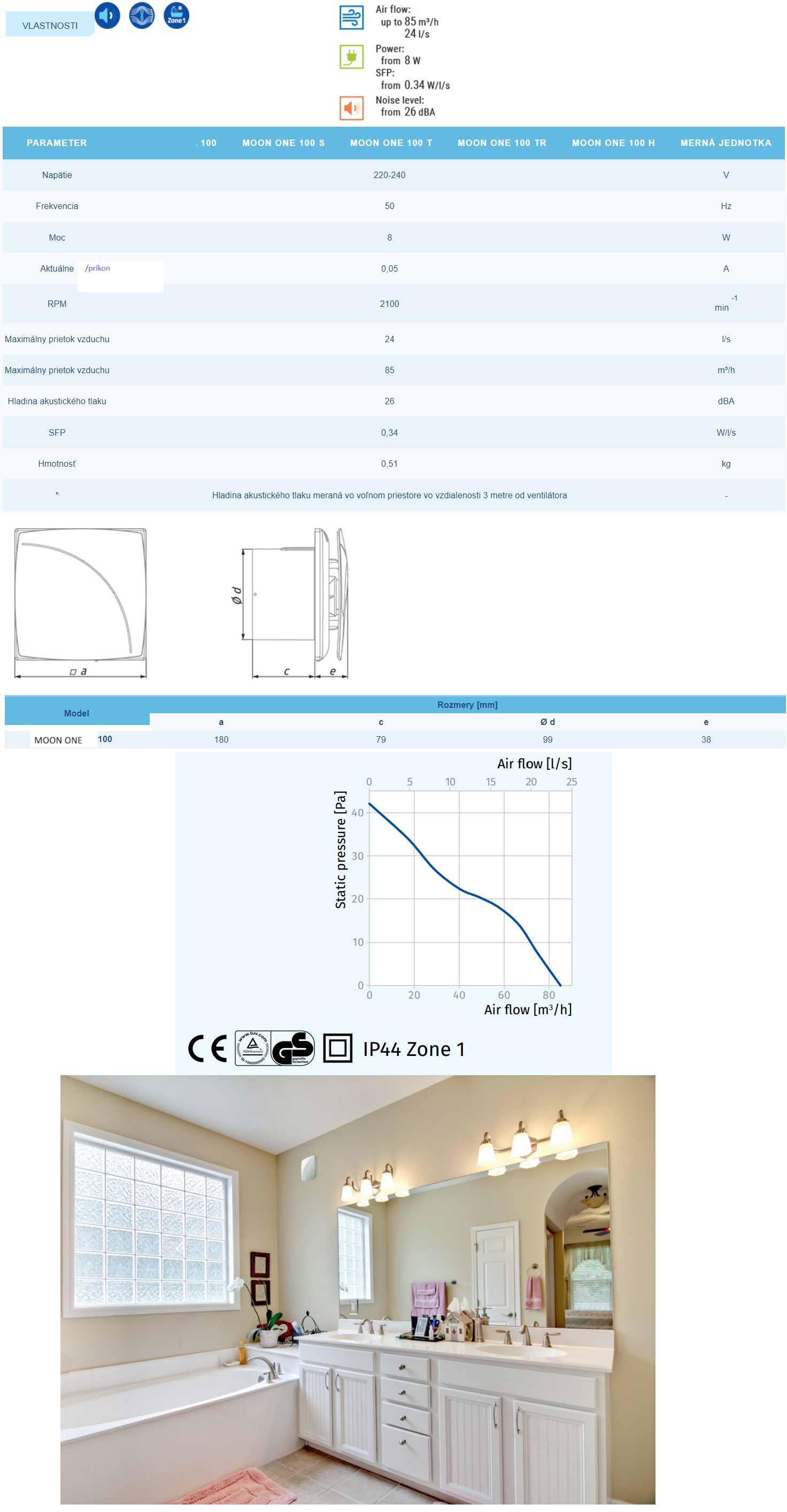 Ventilátor do kúpeľne Blauberg 100 MOON ONE-základ 100mm 85m3/h gulôčkové ložisko vhodné aj do stropu určené na nepretržité alebo periodické odsávanie kúpeľní, spŕch, kuchýň a iných obytných priestorov.