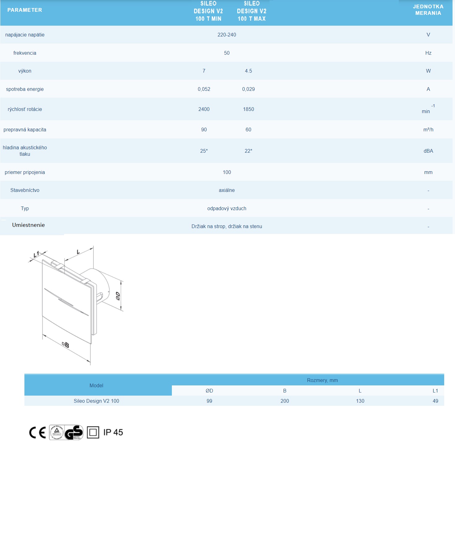 Vysoký stupeň krytia IP45 zaisťuje bezpečnú prevádzku v kúpeľniach a sprchovacích kútoch.