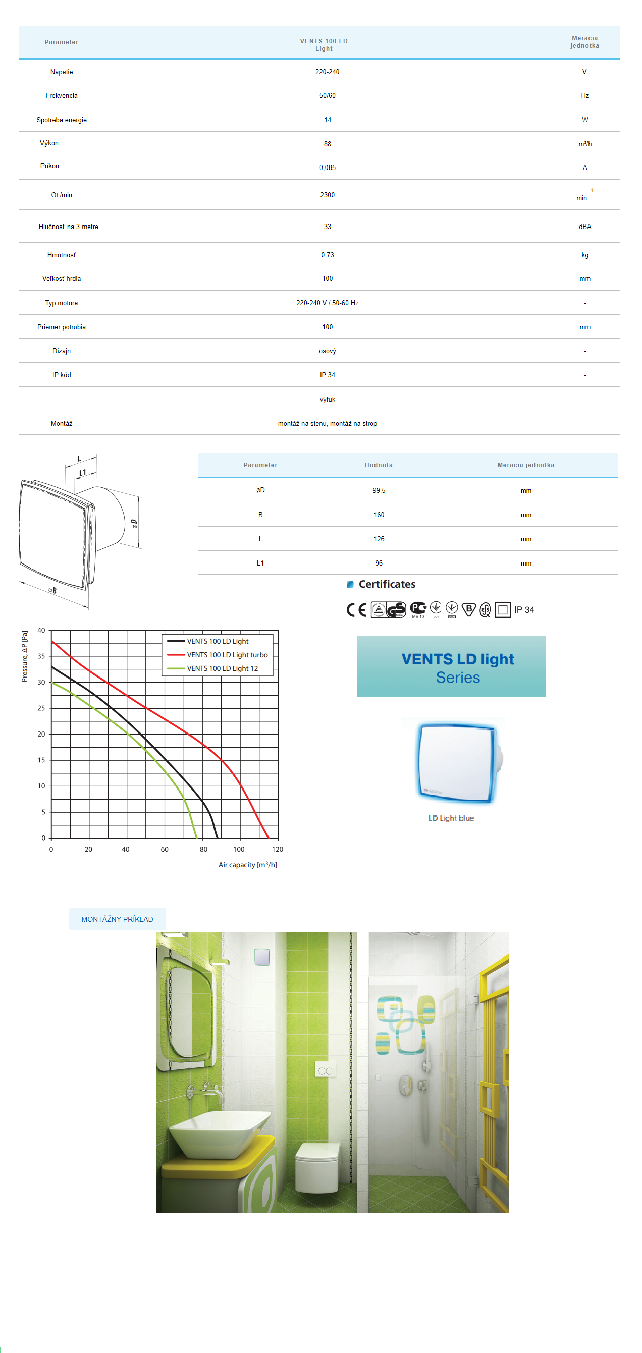 Ventilátory do kúpelne a wc výkon:88m3/h priemer 100mm pre kontinuálne alebo periodické odsávacie vetranie kúpeľní, spŕch, kuchýň a ďalších úžitkových priestorov.Ventilátory do kúpelne a wc upevnenie ventilačného hriadeľa alebo pripojenie potrubia.