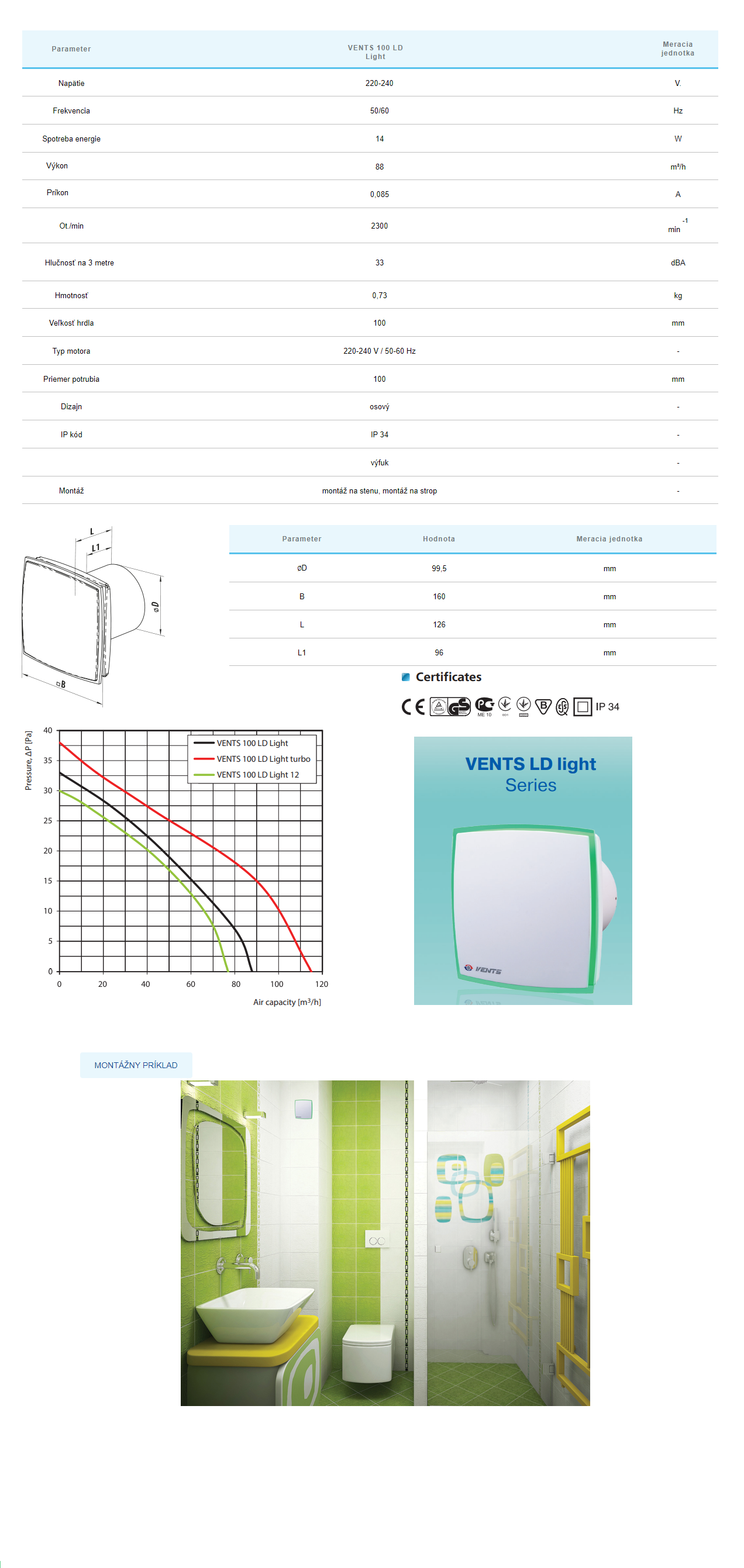 Ventilátory do kúpelne a wc výkon:88m3/h priemer 100mm pre kontinuálne alebo periodické odsávacie vetranie kúpeľní, spŕch, kuchýň a ďalších úžitkových priestorov.Ventilátory do kúpelne a wc upevnenie ventilačného hriadeľa alebo pripojenie potrubia. Nízky až stredný pohyb vzduchu na krátke vzdialenosti s nízkym odporom vzduchu. Kompatibilný so vzduchovými kanálmi 100 mm. DIZAJN Moderný dizajn a originálny vzhľad. Plášť a obežné koleso sú vyrobené z vysoko kvalitného odolného plastu ABS odolného voči UV žiareniu. Okraj predného panelu je vyrobený z priehľadného plexiskla s LED podsvietením rôznych farieb (modrá,zelená). Konštrukcia obežného kolesa zvyšuje účinnosť ventilátora a predlžuje životnosť motora. Krytie IP 34. MOTOR Spoľahlivý motor s nízkou spotrebou energie. Navrhnuté pre nepretržitú prevádzku a nevyžadujú žiadnu údržbu. Vybavený ochranou proti prehriatiu.Ventilátor je namontovaný priamo do ventilačnej šachty. V prípade vzdialeného umiestnenia ventilačného hriadeľa sa odporúča flexibilné potrubné pripojenie. Vzduchové potrubie je pripojené k prírube výfuku ventilátora pomocou svorky. Upevnenie na stenu pomocou skrutiek.Vhodný na montáž na strop.