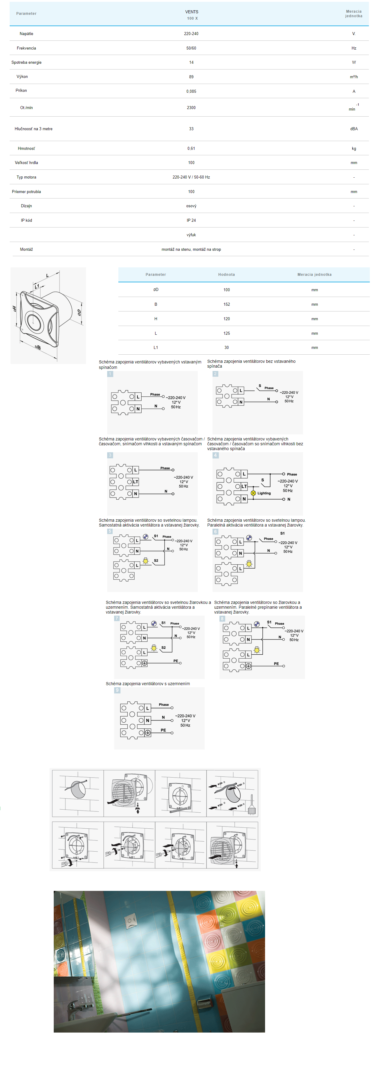 Ventilátor do kúpeľne a do wc Ø100mm výkon 89m3/h.Ventilátor do kúpeľne a do wc predná maska šedej metalízy má moderný dizajn a estetický vzhľad. Plášť a obežné koleso sú vyrobené z vysoko kvalitného odolného plastu ABS odolného voči UV žiareniu. Inteligentný dizajn obežného kolesa zvyšuje účinnosť ventilátora a predlžuje jeho životnosť. Dekoratívne vymeniteľné farebné kryty: svetlo modrá, jasne zelená, žltá a ružová. Krytie IP 24. MOTOR Spoľahlivý a nízko wattový elektromotor. Navrhnuté pre nepretržitú prevádzku a nevyžadujú žiadnu údržbu. Vybavený ochranou proti prehriatiu.MOŽNOSTI MONTÁŽE Ventilátor je namontovaný priamo do ventilačnej šachty. V prípade vzdialeného umiestnenia ventilačného hriadeľa sa odporúča použiť flexibilné potrubie. Vzduchové potrubie je pripojené k prírube výfuku ventilátora pomocou svorky. Pripevnené k stene samoreznými skrutkami. Vhodný na montáž na strop