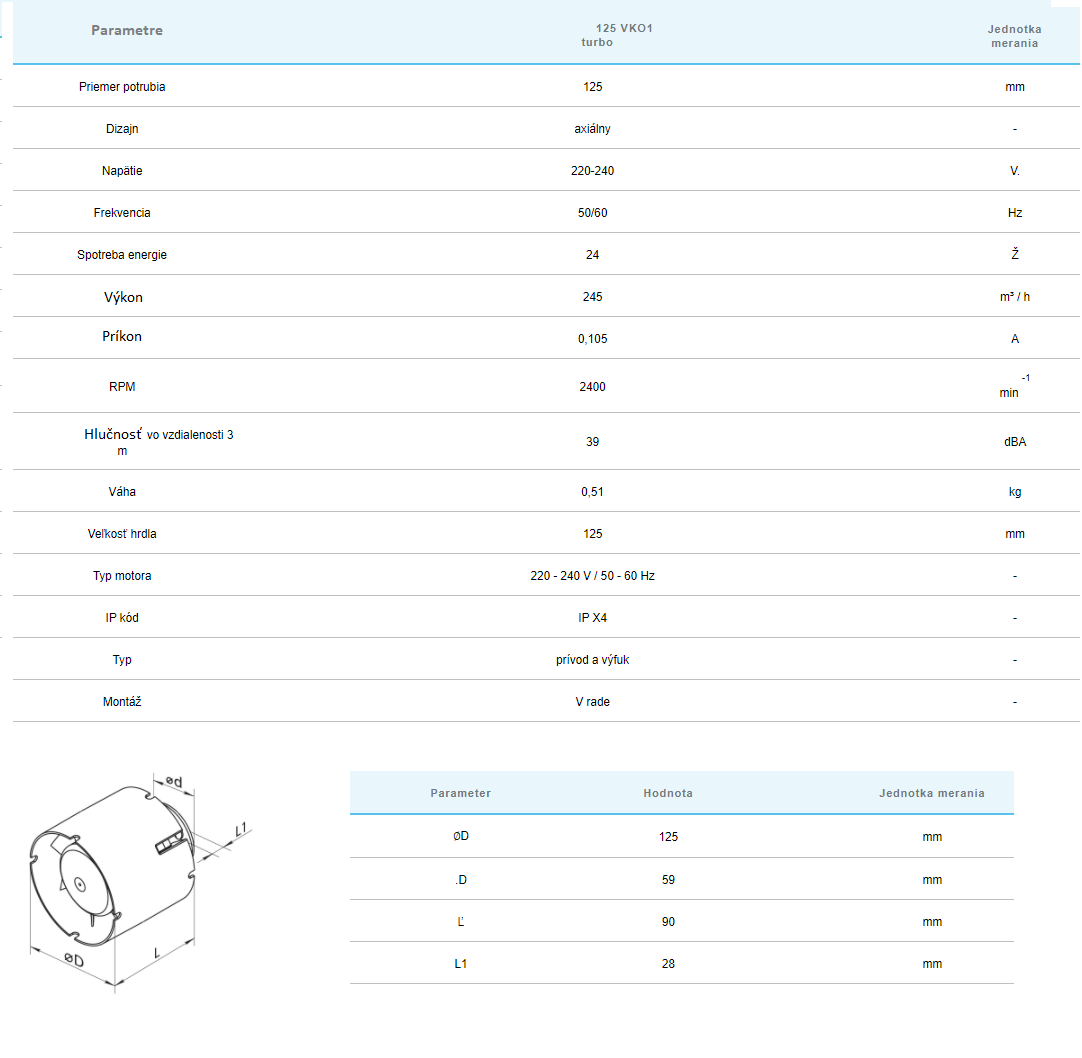 Potrubný ventilátor výkon:245 m3 do potrubia 125mm VENTS 125VKO1L TURBO-