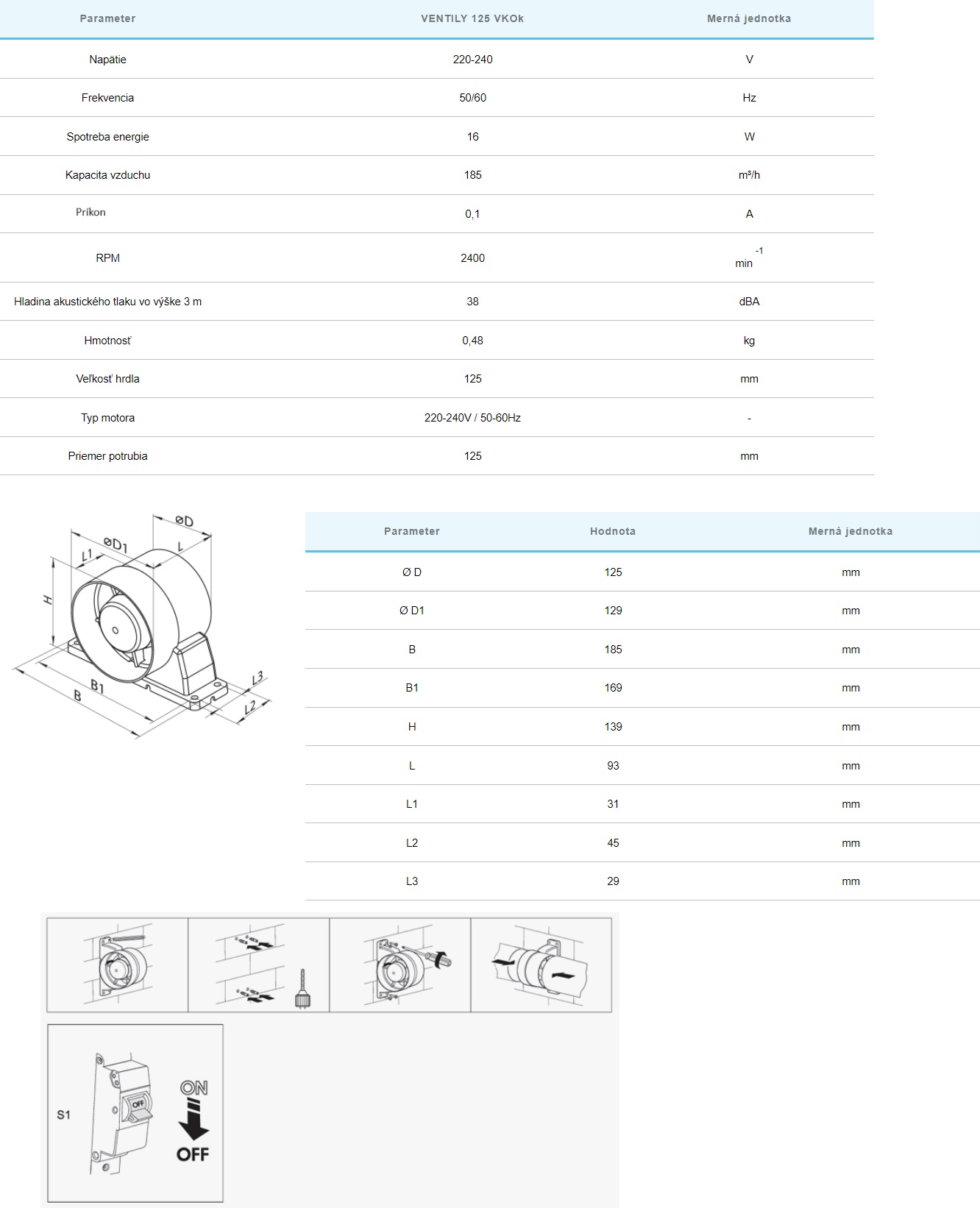 Potrubný ventilátor výkon:185 m3/h do potrubia VENTS 125VKOk-riadenie vypínačom na svetlo.Nepretržité alebo periodické odsávanie kúpeľní, spŕch, kuchýň a iných úžitkových priestorov.