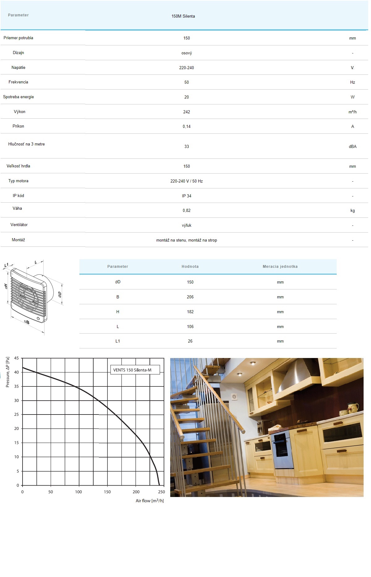 Ventilátor do kúpeľne a WC výkon 242m/h Ø 150mm pre kontinuálne alebo periodické odsávacie vetranie kúpeľní, spŕch, kuchýň a ďalších úžitkových priestorov. Vetranie priestorov s vysokými obmedzeniami hladiny hluku. Upevnenie ventilačného hriadeľa alebo pripojenie potrubia. Kompatibilný so vzduchovými kanálmi Ø 150. DIZAJN Moderný dizajn a estetický vzhľad. Plášť a obežné koleso sú vyrobené z vysoko kvalitného odolného plastu ABS odolného voči UV žiareniu. Inteligentný dizajn obežného kolesa zvyšuje účinnosť ventilátora a predlžuje jeho životnosť. Ventilátor a motor sú navrhnuté špeciálne pre tichý chod.Krytie IP34. MOTOR:Spoľahlivý motor s minimálnym príkonom 20 W (pre priemer 150 mm). Navrhnuté pre nepretržitú prevádzku a nevyžadujú žiadnu údržbu. Vybavený ochranou proti prehriatiu. KONTROLA Ovládanie rýchlosti je možné pomocou tyristorového regulátora rýchlosti . K jednému regulátoru môže byť pripojených niekoľko ventilátorov. Regulátory rýchlosti nemožno pripojiť k ventilátorom s úpravou T , TH , TP , VT , VTH MOŽNOSTI MONTÁŽE Ventilátor je namontovaný priamo do ventilačnej šachty. Pripevnené k stene samoreznými skrutkami. Vhodný na montáž na strop.