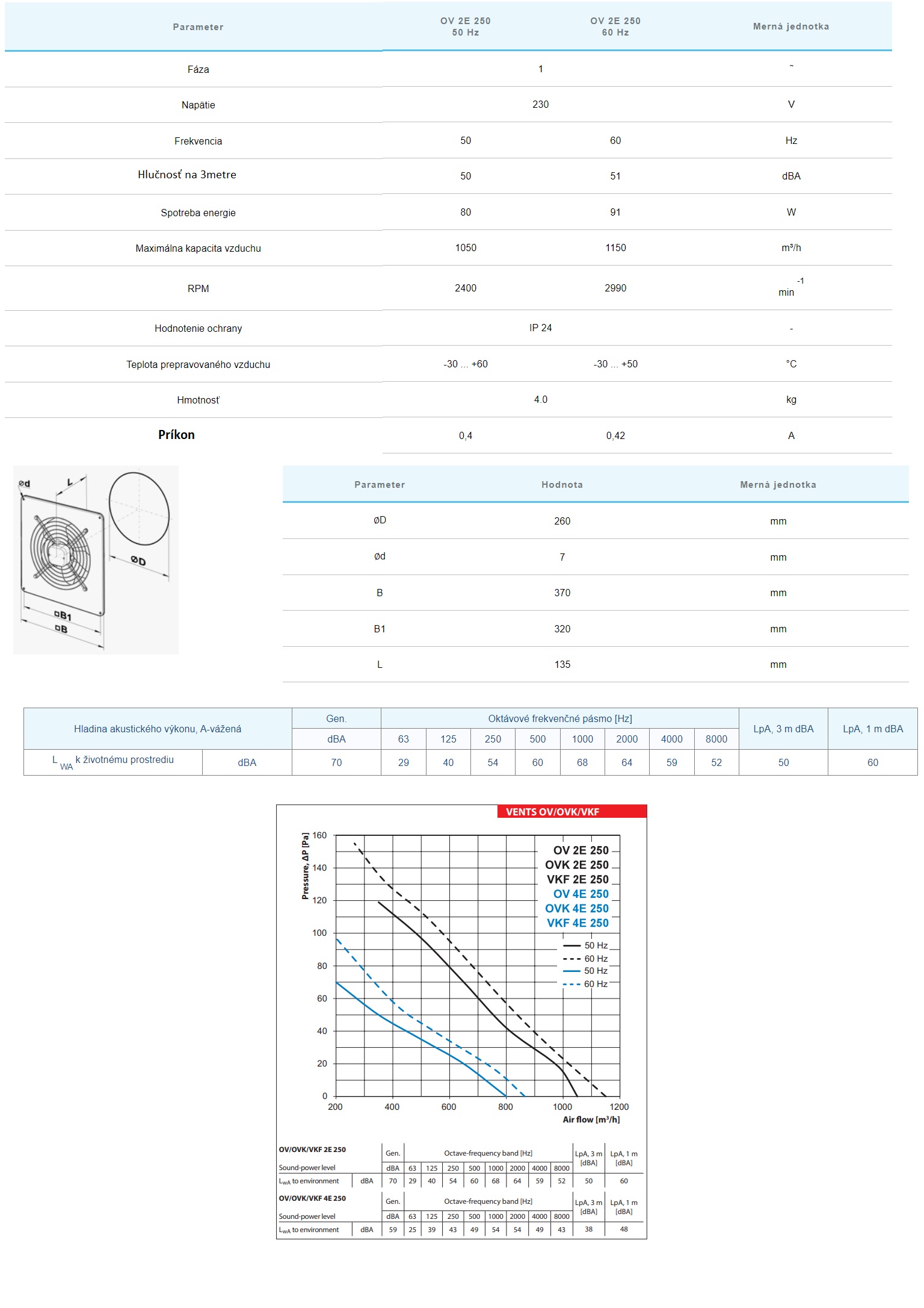 Priemyselný axiálny ventilátor nástenný VENTS OV2 E 250-výkon:1050m3/h priemer napojenia:260mm-Napätie 230Vsú určené pre prívodné a odsávacie vetracie systémy pre rôzne priestory, kde sa vyžaduje vysoký prietok vzduchu pri relatívne nízkom odpore systému. Ventilátory OV je možné použiť na priamy odvod vzduchu alebo pretlakovanie v systémoch odvetrávania dymu. OV ventilátory sú vhodné pre vonkajšiu montáž na stenu. DIZAJN Plášť ventilátora a obežné koleso sú vyrobené z ocele s polymérnym povlakom. Svorkovnica ventilátora OV je vybavená káblom pre diaľkové pripojenie. MOTOR Obežné kolesá sú poháňané dvojpólovými, jednofázovými asynchrónnymi motormi s vonkajším rotorom a vstavanou tepelnou ochranou proti prehriatiu v závislosti od modelu. Guličkové ložiská v motore poskytujú dlhú životnosť navrhnutú na minimálne 40 000 hodín. Krytie motora IP44-IP54. KONTROLA RÝCHLOSTI Plynulá alebo skoková regulácia otáčok sa vykonáva pomocou tyristorového alebo autotransformátorového regulátora. K jednému regulátoru je možné pripojiť viacero ventilátorov, ak celkový výkon a prevádzkový prúd nepresiahnu menovité hodnoty regulátora. MONTÁŽ Ventilátor sa inštaluje na povrch steny pomocou štvorcovej montážnej dosky série OV . Ventilátor je napájaný cez externú vzdialenú svorkovnicu. Napájanie a inštaláciu je potrebné vykonať v súlade s návodom a schémou zapojenia na svorkovnici.