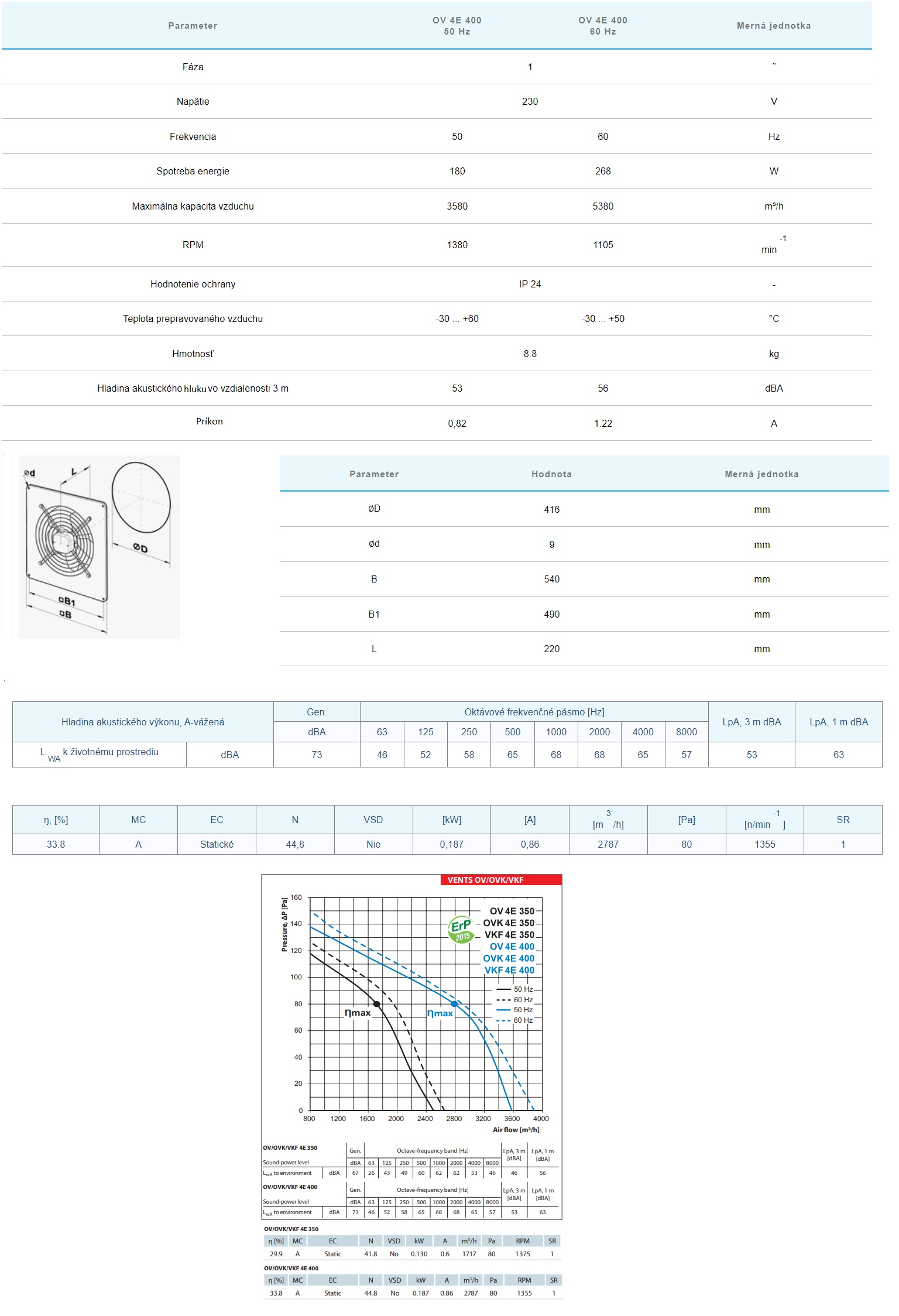 Axiálne nástenné priemyselné ventilátory sú určené pre prívodné a odsávacie vetracie systémy pre rôzne priestory, kde sa vyžaduje vysoký prietok vzduchu pri relatívne nízkom odpore systému. Ventilátory OV je možné použiť na priamy odvod vzduchu alebo pretlakovanie v systémoch odvetrávania dymu. OV ventilátory sú vhodné pre vonkajšiu montáž na stenu. DIZAJN Plášť ventilátora a obežné koleso sú vyrobené z ocele s polymérnym povlakom. Svorkovnica ventilátora OV je vybavená káblom pre diaľkové pripojenie. MOTOR Obežné kolesá sú poháňané štvorpólovými, jednofázovými asynchrónnymi motormi s vonkajším rotorom a vstavanou tepelnou ochranou proti prehriatiu v závislosti od modelu. Guličkové ložiská v motore poskytujú dlhú životnosť navrhnutú na minimálne 40 000 hodín. Krytie motora IP44-IP54. KONTROLA RÝCHLOSTI Plynulá alebo skoková regulácia otáčok sa vykonáva pomocou tyristorového alebo autotransformátorového regulátora. K jednému regulátoru je možné pripojiť viacero ventilátorov, ak celkový výkon a prevádzkový prúd nepresiahnu menovité hodnoty regulátora. MONTÁŽ Ventilátor sa inštaluje na povrch steny pomocou štvorcovej montážnej dosky série OV . Ventilátor je napájaný cez externú vzdialenú svorkovnicu. Napájanie a inštaláciu je potrebné vykonať v súlade s návodom a schémou zapojenia na svorkovnici.