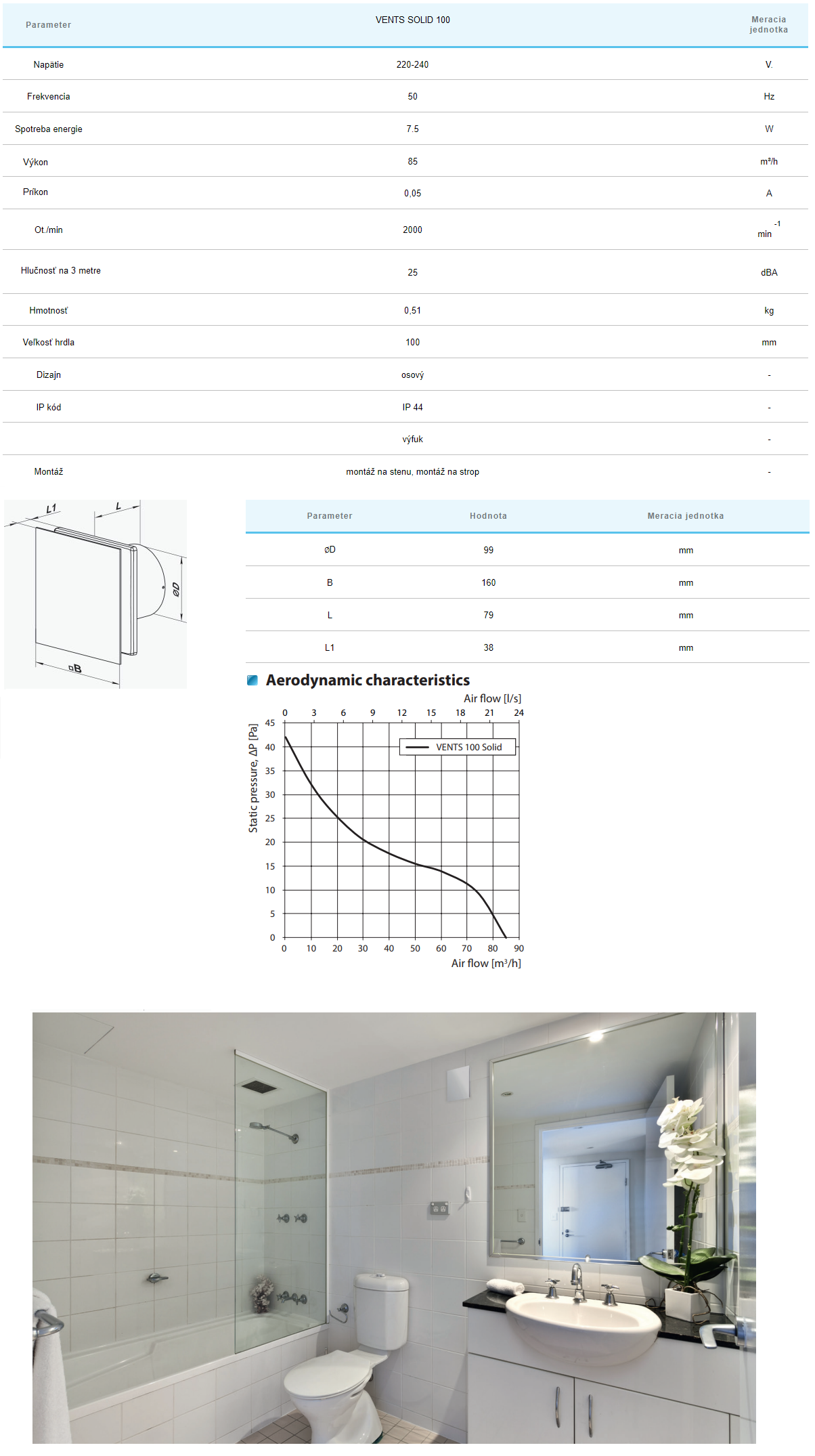 Ventilátor do kúpeľne a do wc výkon 85m3/h ∅100mm so zníženou hlučnosťou VENTS 100 Solid je určené na trvalé alebo prerušované vetranie v sprchách, kúpeľniach, kuchyniach a iných obytných priestoroch.