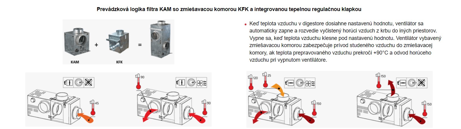 Spustenie krbového ventilátora sa uskutočňuje v rozsahu 0 °C až +90 °С v závislosti od teploty vzduchu generovaného v krbovom výmenníku.