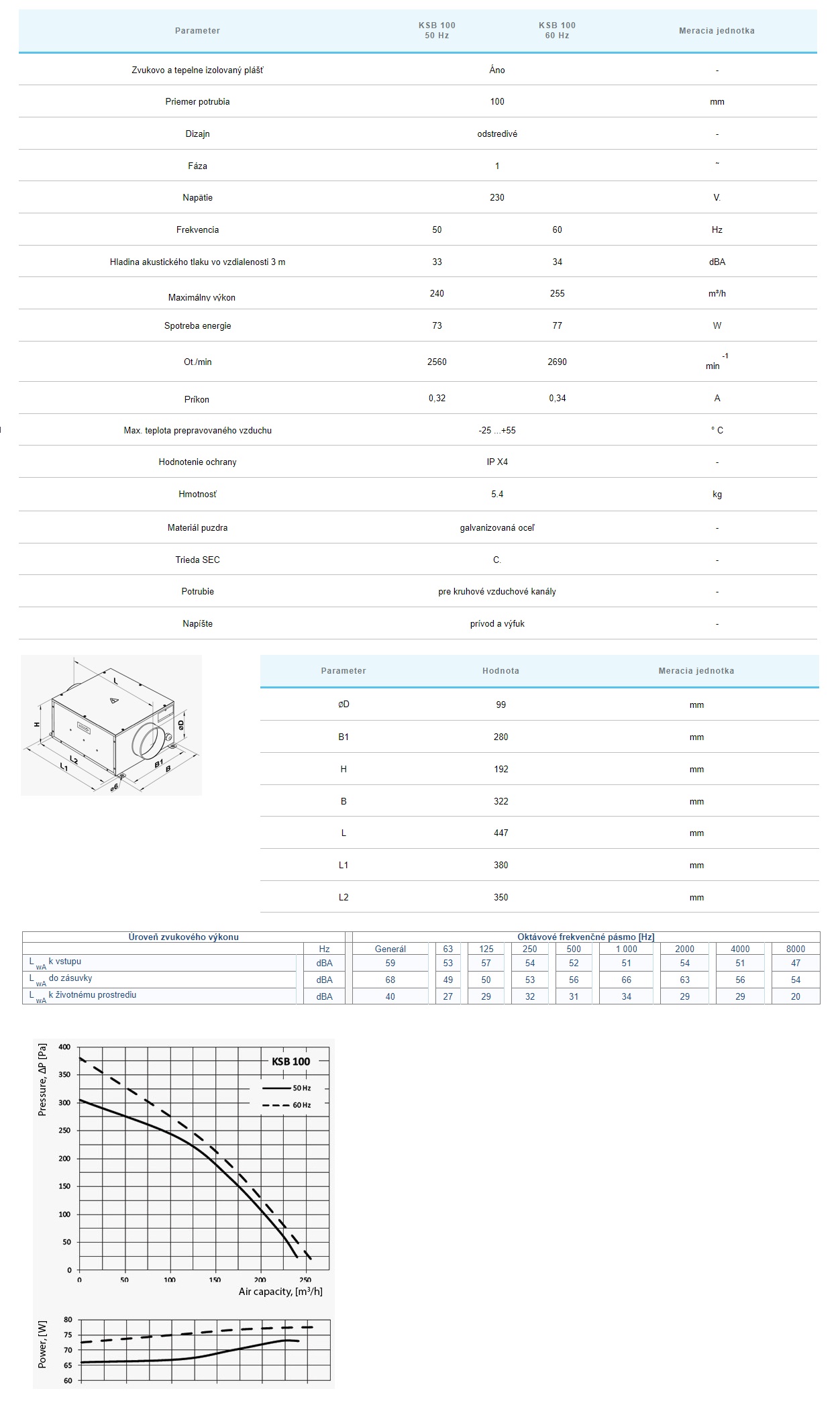 Radiálne ventilátory Ø100mm  výkon 240m3/h nízkohlukové na umiestnemie do podhľadov a iných málo prístupných priestorov Kryt ventilátora je vyrobený z Aluzinkového plechu. Tepelne a zvukovo izolačná vrstva je vyrobená z penového polystyrénu.Obežné koleso je vyrobené z pozinkovanej ocele a dopredu zahnutými lopatkami ,je poháňaný pomocou 2 pólovým asynchrónnym motorom . Motor je vybavený guličkovými ložiskami pre dlhšiu životnosť. Pre presnú funkčnosť a bezpečnú prevádzku  je každé obežné koleso  dynamicky vyvážené. Motor krytie IP 44.