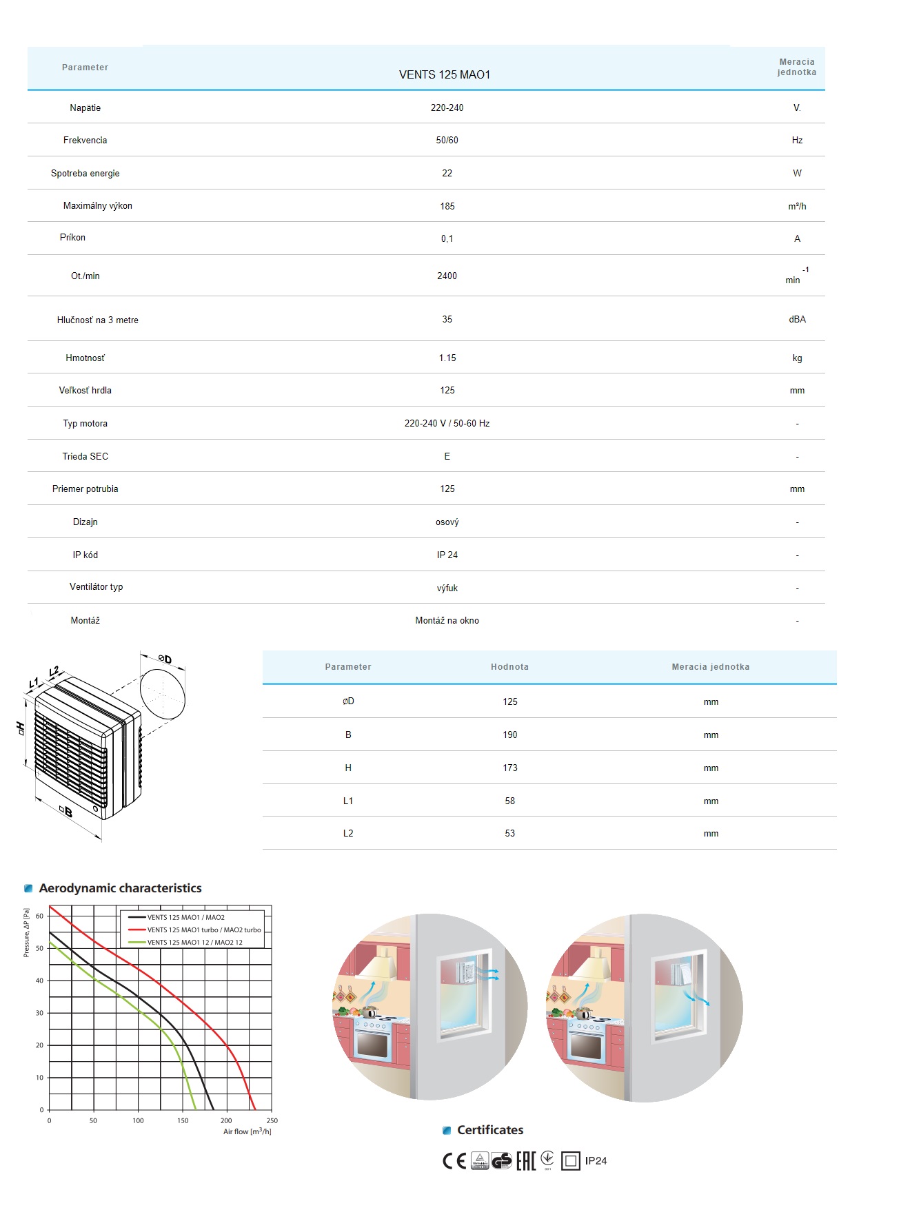 Ventilátor do okna VENTS MAO1Ø125mm výkon 185m3/h 230V.Kontinuálne alebo periodické odsávacie vetranie kúpeľní, spŕch, kuchýň a ďalších úžitkových priestorov.