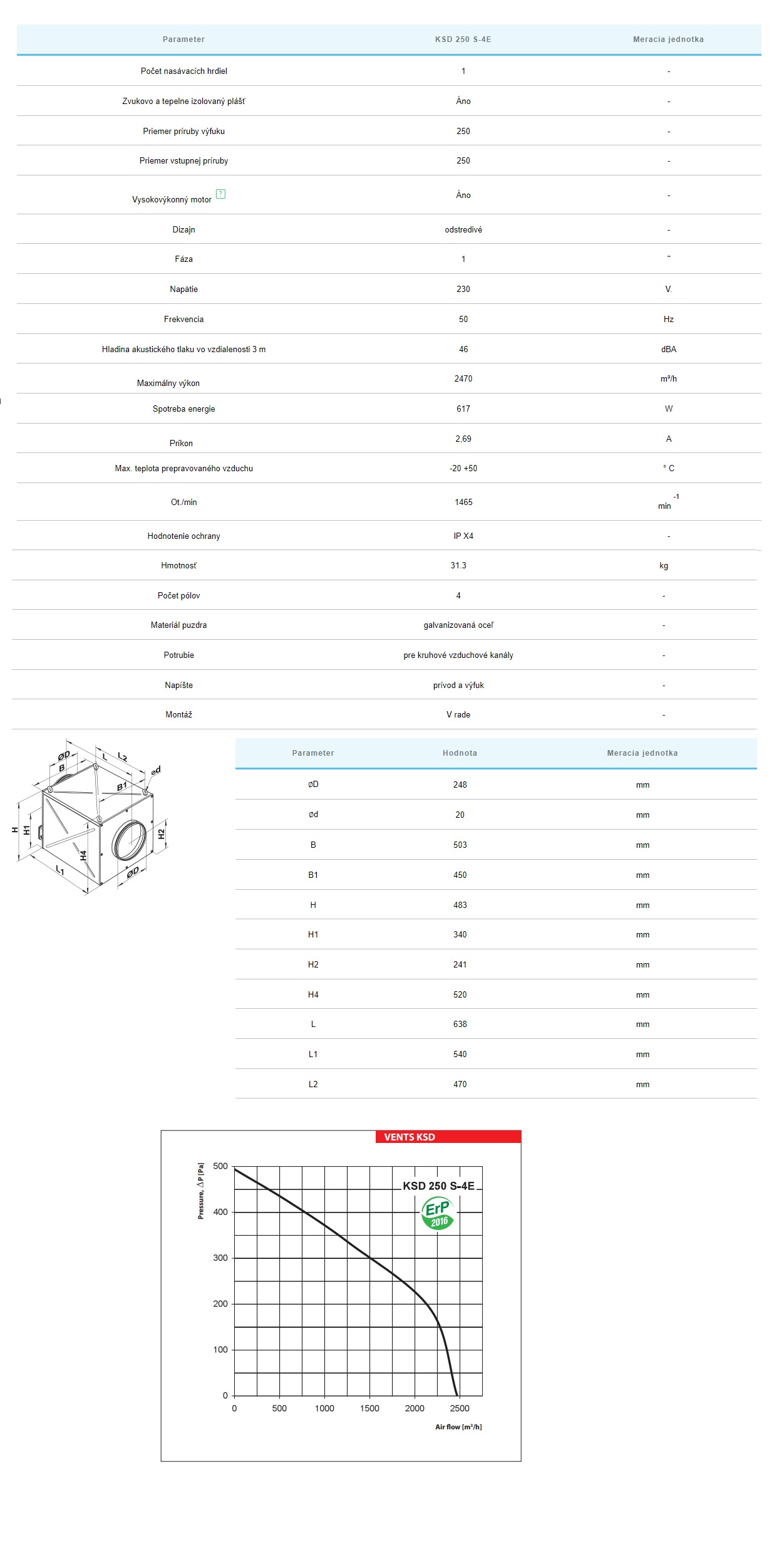 Radiálne ventilátory VENTS KSD 4E 250S Ø250mm výkon 2470m3/h.Radiálne ventilátory KSD je určený pre použitie na odvetranie miestností s väčším nárokom na hluk.Plášť ventilátora je vyrobený z pozinkovaného oceľového plechu a tepelne a zvukovo izolačného materiálu. Pripojovacie príruby sú opatrené gumovým tesnením. .Priemyselné ventilátory sú vybavené 4 alebo 6-pólový asynchrónnym motorom vybavený dvojitým vstupným obežným kolesom s lopatkami zakrivenými vpred. Motor je vybavený ochranou proti prehriatiu s automatickým reštartom. Vzhľadom ,že guličkové ložiská sú vybavené zo špeciálne vybraného typu maziva ventilátor je bezúdržbový a vyznačuje sa bezhlučnou prevádzkou.Priemyselné ventilátory sú určené pre montáž s kruhovým rozvodom.Ventilátor je vhodný pre montáž v ľubovoľnej polohe v súlade so smerom pohybu vzduchu v systéme (znázornené ukazovateľom na skrini ventilátora). Pri montáži potrebujeme dostatočný priestor pre údržbu ventilátora.
