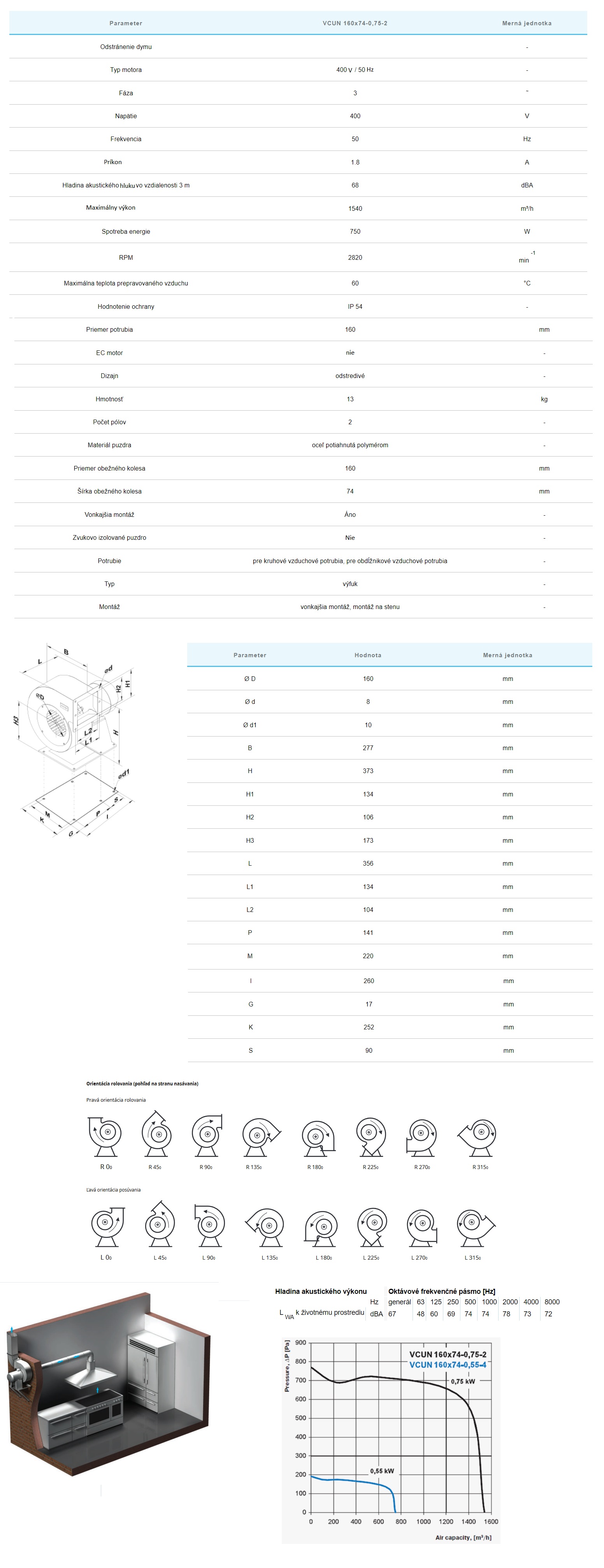 Radiálne ventilátory vysokovýkonné.Výkon 1540m3/h 3-fázový.Radiálne ventilátory sú určené pre odťahovú ventiláciu rôznych priestorov.Prívodné a odsávacie vetracie systémy pre obchodné, kancelárske a iné verejné alebo priemyselné priestory. Ventilátory je možné použiť ako komponenty pre ventilačné a klimatizačné jednotky a sú vhodné pre vonkajšiu montáž. DIZAJN Kryt ventilátora je vyrobený z ocele s polymérnym povlakom. Ventilátor VCUN môže byť dodaný s obežným kolesom v smere alebo proti smeru hodinových ručičiek. Každá modifikácia má niekoľko rolovacích pozícií, ktoré umožňujú pripojenie k vzduchovým kanálom v akomkoľvek uhle s rozstupom 45°. MOTOR Obežné koleso s pozinkovanými dopredu zahnutými lopatkami je namontované priamo na hriadeli 2-pólového trojfázového asynchrónneho motora. Guličkové ložiská v motore zaisťujú dlhú životnosť. Pre presné vlastnosti, bezpečnú prevádzku a nízku hlučnosť je každá turbína pri montáži dynamicky vyvážená.Krytie motora IP54. KONTROLA RÝCHLOSTI Plynulé alebo skokové riadenie rýchlosti sa vykonáva pomocou autotransformátora alebo regulátora frekvencie. K jednému regulátoru je možné pripojiť viacero ventilátorov v prípade, že celkový výkon a prevádzkový prúd nepresiahnu menovité hodnoty regulátora. MONTÁŽ Ventilátor je vhodný na inštaláciu do odvetrávacích komôr, klimatizačných jednotiek alebo je možné ho použiť samostatne. V prípade samostatnej prevádzky môže byť napojená na vzduchové potrubie pomocou výfukovej aj sacej vetvy alebo len výfukovej vetvy.