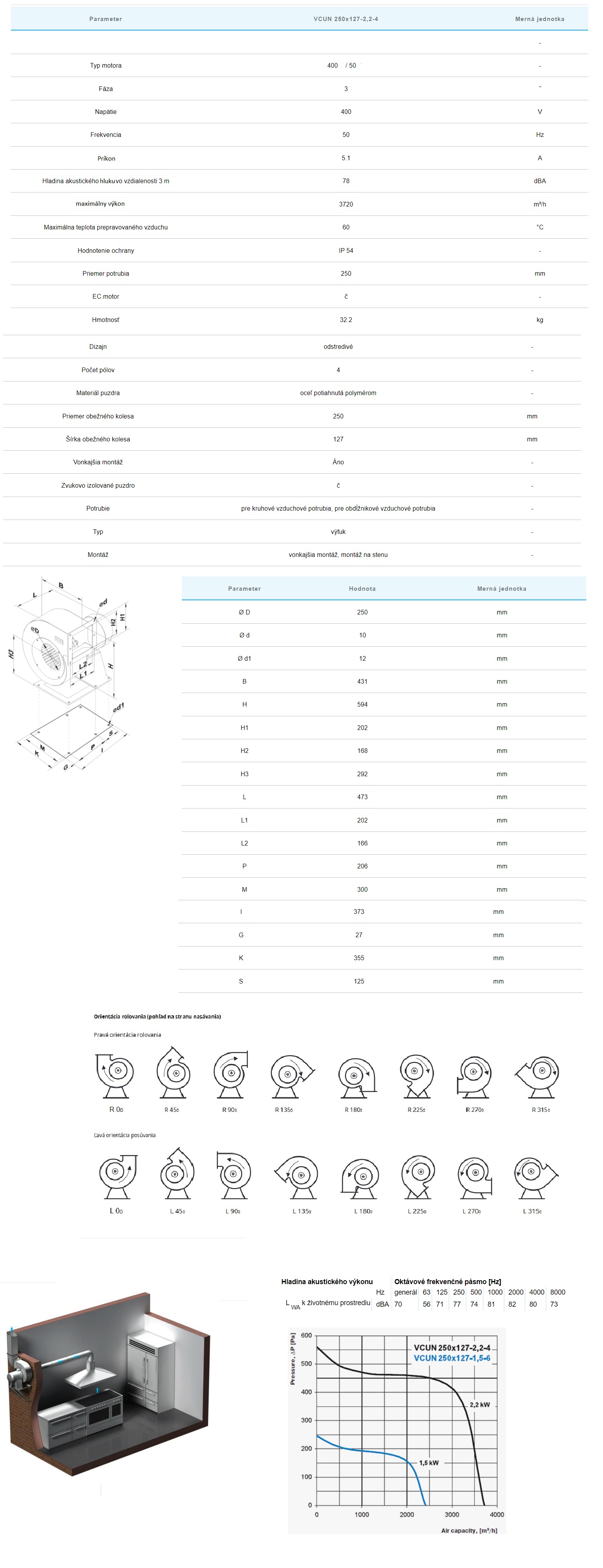 Radiálne ventilátory vysokovýkonné.Výkon 3720m3/h 3-fázový.Radiálne ventilátory sú určené pre odťahovú ventiláciu rôznych priestorov.Prívodné a odsávacie vetracie systémy pre obchodné, kancelárske a iné verejné alebo priemyselné priestory. Ventilátory je možné použiť ako komponenty pre ventilačné a klimatizačné jednotky a sú vhodné pre vonkajšiu montáž. DIZAJN Kryt ventilátora je vyrobený z ocele s polymérnym povlakom. Ventilátor VCUN môže byť dodaný s obežným kolesom v smere alebo proti smeru hodinových ručičiek. Každá modifikácia má niekoľko rolovacích pozícií, ktoré umožňujú pripojenie k vzduchovým kanálom v akomkoľvek uhle s rozstupom 45°. MOTOR Obežné koleso s pozinkovanými dopredu zahnutými lopatkami je namontované priamo na hriadeli 4-pólového trojfázového asynchrónneho motora. Guličkové ložiská v motore zaisťujú dlhú životnosť. Pre presné vlastnosti, bezpečnú prevádzku a nízku hlučnosť je každá turbína pri montáži dynamicky vyvážená.Krytie motora IP54. KONTROLA RÝCHLOSTI Plynulé alebo skokové riadenie rýchlosti sa vykonáva pomocou autotransformátora alebo regulátora frekvencie. K jednému regulátoru je možné pripojiť viacero ventilátorov v prípade, že celkový výkon a prevádzkový prúd nepresiahnu menovité hodnoty regulátora. MONTÁŽ Ventilátor je vhodný na inštaláciu do odvetrávacích komôr, klimatizačných jednotiek alebo je možné ho použiť samostatne. V prípade samostatnej prevádzky môže byť napojená na vzduchové potrubie pomocou výfukovej aj sacej vetvy alebo len výfukovej vetvy.