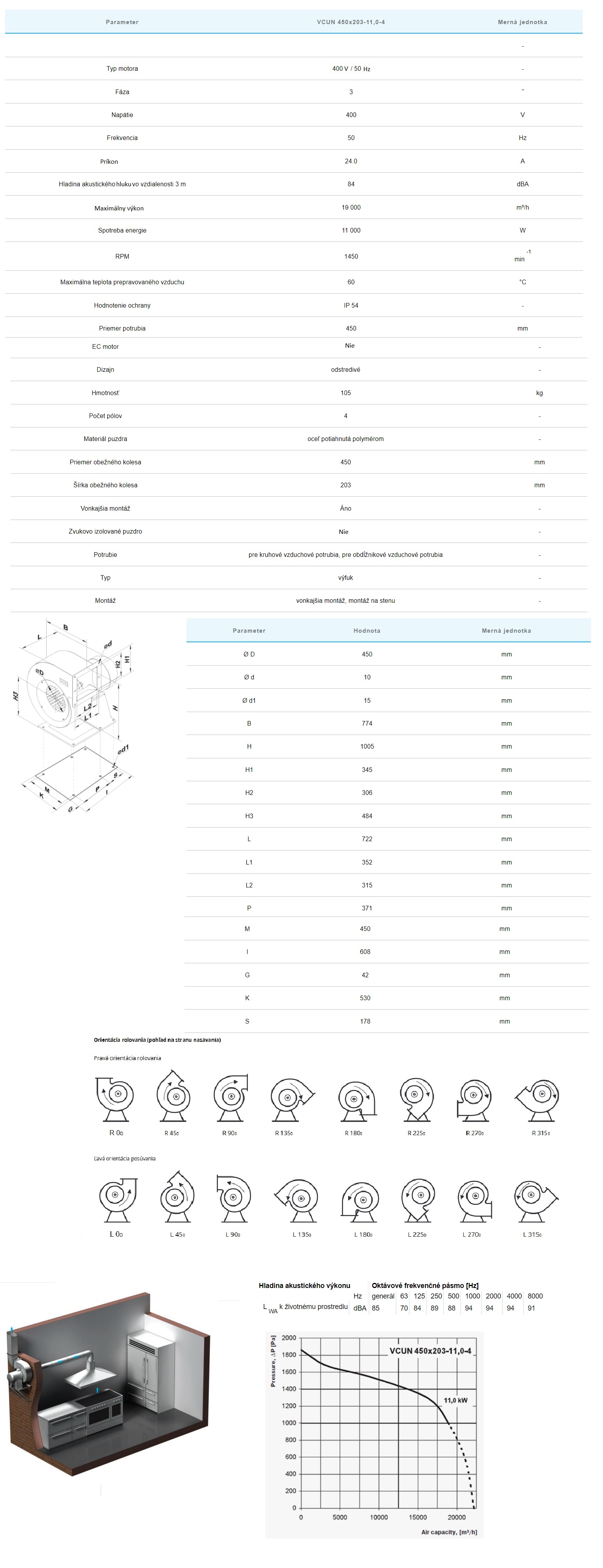 Radiálne ventilátory vysokovýkonné.Výkon 19 000m3/h 3-fázový.Radiálne ventilátory sú určené pre odťahovú ventiláciu rôznych priestorov.Radiálne ventilátory sú určené pre odťahovú ventiláciu rôznych priestorov.Ventilátory je možné použiť ako komponenty pre ventilačné a klimatizačné jednotky a sú vhodné pre vonkajšiu montáž. DIZAJN Kryt ventilátora je vyrobený z ocele s polymérnym povlakom. Ventilátor VCUN môže byť dodaný s obežným kolesom v smere alebo proti smeru hodinových ručičiek. Každá modifikácia má niekoľko rolovacích pozícií, ktoré umožňujú pripojenie k vzduchovým kanálom v akomkoľvek uhle s rozstupom 45°. MOTOR Obežné koleso s pozinkovanými dopredu zahnutými lopatkami je namontované priamo na hriadeli 4-pólového trojfázového asynchrónneho motora. Guličkové ložiská v motore zaisťujú dlhú životnosť. Pre presné vlastnosti, bezpečnú prevádzku a nízku hlučnosť je každá turbína pri montáži dynamicky vyvážená.Krytie motora IP54. KONTROLA RÝCHLOSTI Plynulé alebo skokové riadenie rýchlosti sa vykonáva pomocou autotransformátora alebo regulátora frekvencie. K jednému regulátoru je možné pripojiť viacero ventilátorov v prípade, že celkový výkon a prevádzkový prúd nepresiahnu menovité hodnoty regulátora. MONTÁŽ Ventilátor je vhodný na inštaláciu do odvetrávacích komôr, klimatizačných jednotiek alebo je možné ho použiť samostatne. V prípade samostatnej prevádzky môže byť napojená na vzduchové potrubie pomocou výfukovej aj sacej vetvy alebo len výfukovej vetvy.