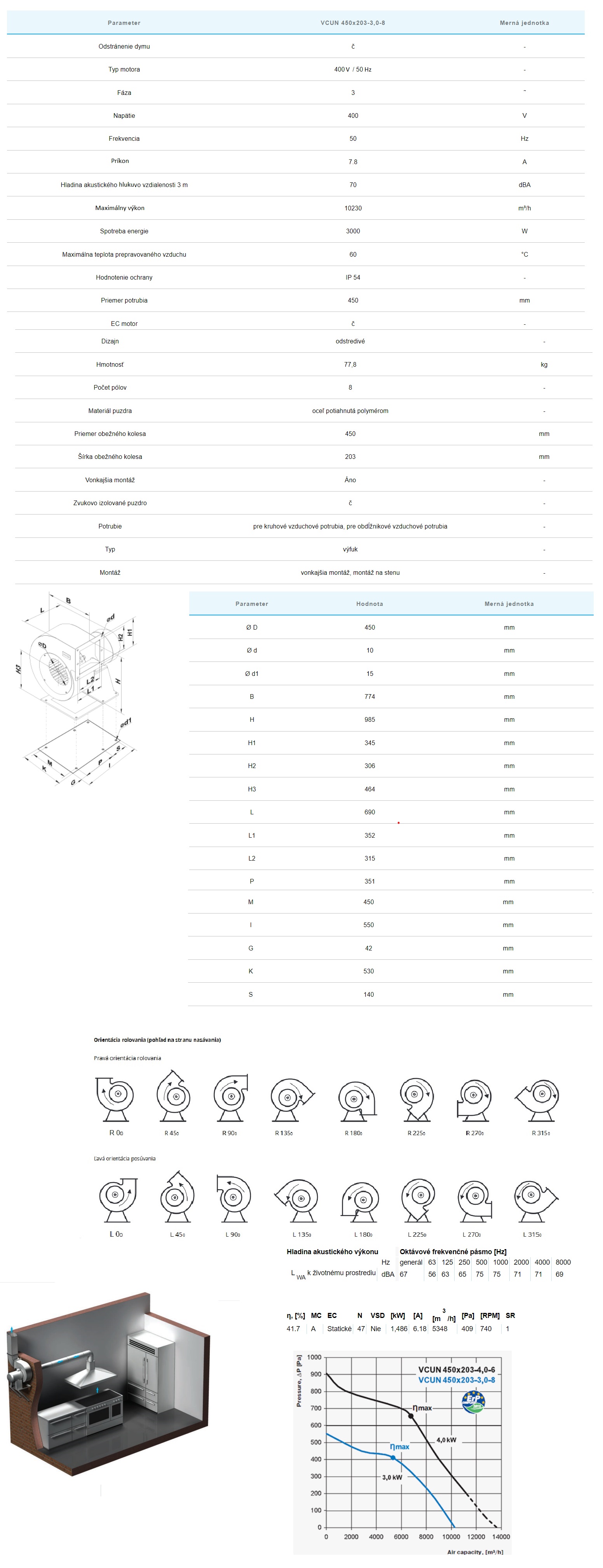 Radiálne ventilátory vysokovýkonné.Výkon 10 230m3/h 3-fázový.Radiálne ventilátory sú určené pre odťahovú ventiláciu rôznych priestorov.Radiálne ventilátory sú určené pre odťahovú ventiláciu rôznych priestorov.Ventilátory je možné použiť ako komponenty pre ventilačné a klimatizačné jednotky a sú vhodné pre vonkajšiu montáž. DIZAJN Kryt ventilátora je vyrobený z ocele s polymérnym povlakom. Ventilátor VCUN môže byť dodaný s obežným kolesom v smere alebo proti smeru hodinových ručičiek. Každá modifikácia má niekoľko rolovacích pozícií, ktoré umožňujú pripojenie k vzduchovým kanálom v akomkoľvek uhle s rozstupom 45°. MOTOR Obežné koleso s pozinkovanými dopredu zahnutými lopatkami je namontované priamo na hriadeli 8-pólového trojfázového asynchrónneho motora. Guličkové ložiská v motore zaisťujú dlhú životnosť. Pre presné vlastnosti, bezpečnú prevádzku a nízku hlučnosť je každá turbína pri montáži dynamicky vyvážená.Krytie motora IP54. KONTROLA RÝCHLOSTI Plynulé alebo skokové riadenie rýchlosti sa vykonáva pomocou auto transformátora alebo regulátora frekvencie. K jednému regulátoru je možné pripojiť viacero ventilátorov v prípade, že celkový výkon a prevádzkový prúd nepresiahnu menovité hodnoty regulátora. MONTÁŽ Ventilátor je vhodný na inštaláciu do odvetrávacích komôr, klimatizačných jednotiek alebo je možné ho použiť samostatne. V prípade samostatnej prevádzky môže byť napojená na vzduchové potrubie pomocou výfukovej aj sacej vetvy alebo len výfukovej vetvy.