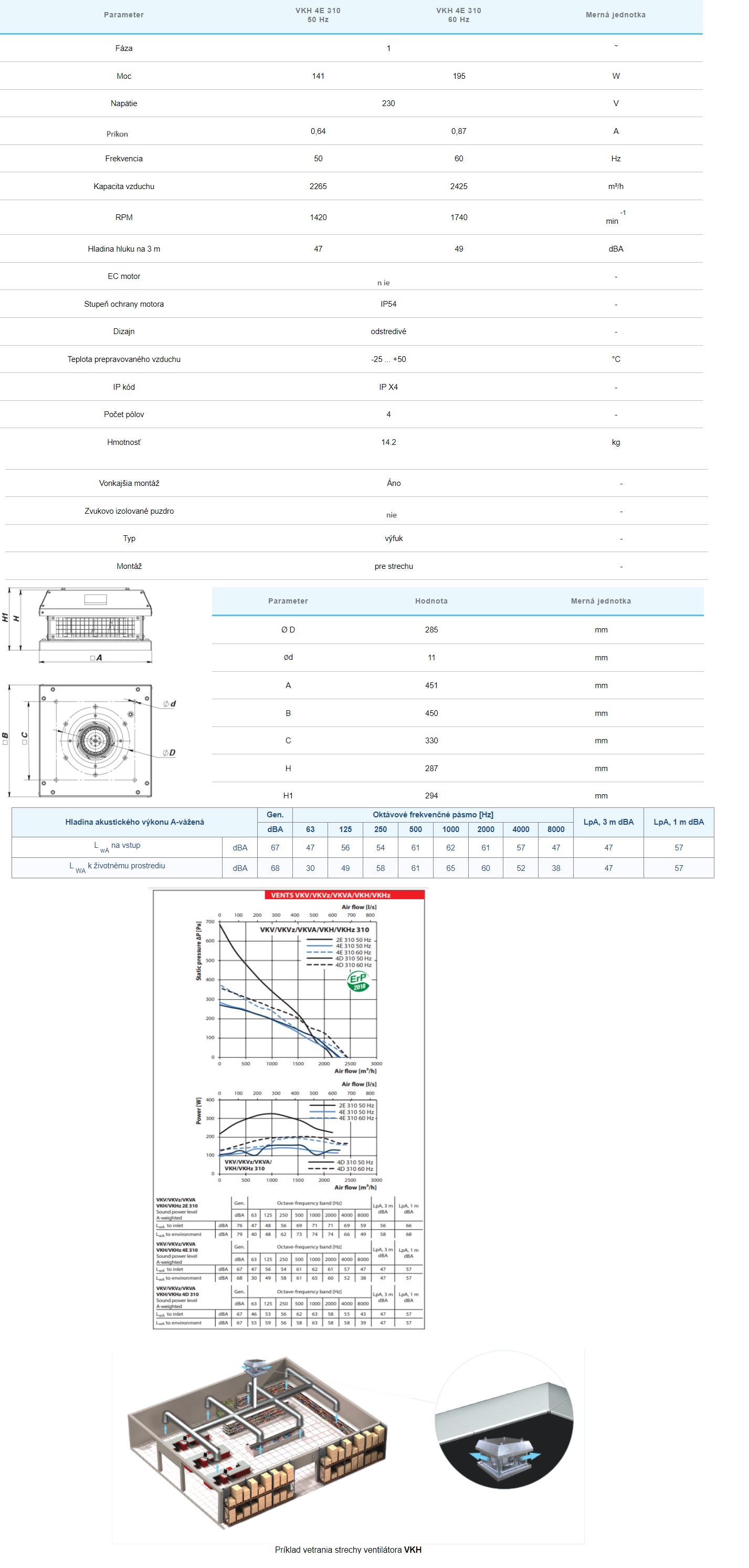 Radiálne strešné ventilátory sú určené pre odsávacie ventilačné systémy pre obchodné, kancelárske a iné verejné alebo priemyselné priestory pre rôzne priestory vhodné pre montáž na strechu. Kompatibilné so vzduchovými kanálmi Ø 250až 315-mm. Vhodné pre všetky typy striech, ako aj vertikálne vetracie šachty. MOTOR 4-pólové jednofázové asynchrónne motory s vonkajším rotorom a obežným kolesom s dozadu zahnutými lopatkami. Motor je vybavený tepelnou ochranou proti prehriatiu s automatickým reštartom ako aj guľôčkovými ložiskami pre dlhú životnosť. Pre presné vlastnosti, bezpečnú prevádzku a nízku hlučnosť je každá turbína pri montáži dynamicky vyvážená. Krytie motora IP44, IP54. KONTROLA RÝCHLOSTI Plynulá alebo skoková regulácia otáčok sa vykonáva pomocou tyristorového alebo autotransformátorového regulátora. K jednému regulátoru je možné pripojiť viacero ventilátorov v prípade, že celkový výkon a prevádzkový prúd nepresiahnu menovité hodnoty regulátora. DIZAJN Kryt ventilátora je vyrobený z ocele s polymérnym povlakom ( modely VENTS VKH ). MONTÁŽ Ventilátor sa montuje na strechu priamo nad vetracie potrubie alebo šachtu a je pevne pripevnený k rovnej ploche pomocou spojovacej dosky. Pri montáži ventilátorov VKH priamo na plochú strechu je potrebné zabezpečiť podperný blok, ktorý zabráni kvapkaniu vody a snehu do prieduchu vetracej šachty. Elektrické pripojenie a inštalácia sa musí vykonať v súlade s návodom a schémou zapojenia na svorkovnici.