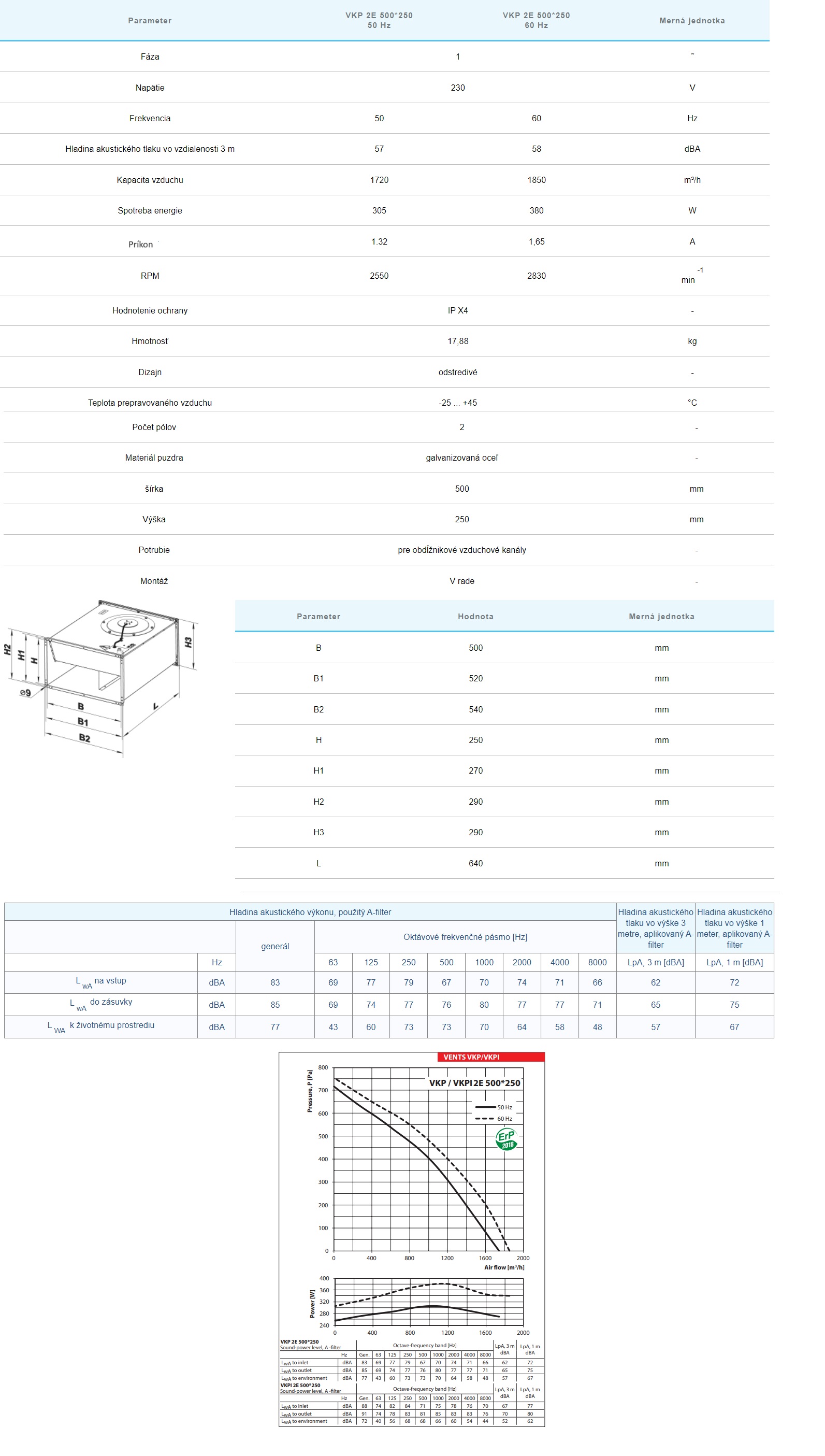 Radiálny ventilátor výkon 1720m3/h 230V pre systémy na prívod a odvod vzduchu pre obchodné, kancelárske a iné verejné alebo priemyselné priestory s obmedzeným montážnym priestorom. Pre spojenie s pravouhlým potrubím 500*250 DIZAJN Kryt ventilátora je vyrobený z pozinkovanej ocele. MOTOR Obežné kolesá s dozadu zahnutými lopatkami obežného kolesa z pozinkovanej ocele sú poháňané pomocou 2-pólových asynchrónnych motorov s vonkajším rotorom. Motory sú dodávané so zabudovanou ochranou proti prehriatiu s automatickým reštartom alebo svorkami tepelnej ochrany vyvedenými von pre pripojenie k externým ochranným zariadeniam v závislosti od modelu, pozri schému zapojenia motor je vybavený guľôčkovými ložiskami pre dlhú životnosť. Pre presné vlastnosti, bezpečnú prevádzku a nízku hlučnosť je každé obežné koleso pri montáži dynamicky vyvážené. Krytie motora IP44. KONTROLA RÝCHLOSTI Plynulé alebo skokové riadenie rýchlosti sa vykonáva pomocou tyristorového alebo autotransformátorového regulátora. K jednému regulátoru je možné pripojiť viacero ventilátorov v prípade, že celkový výkon a prevádzkový prúd neprekročí menovité hodnoty regulátora. MONTÁŽ Ventilátory sa montujú do pravouhlých potrubí a v prípade priameho pripojenia nevyžadujú žiadne špeciálne upevnenie. V prípade pripojenia cez flexibilné konektory je ventilátor pripevnený k budove pomocou podpier, závesných konzol alebo fixačných konzol. Ventilátory je možné namontovať v ľubovoľnej polohe vzhľadom na smer prúdenia vzduchu (označené šípkou na kryte). Musí byť zabezpečený prístup pre údržbu ventilátora. Ventilátor je napájaný cez externé svorky. Kryt je vybavený odnímateľným prístupovým krytom pre účely údržby.