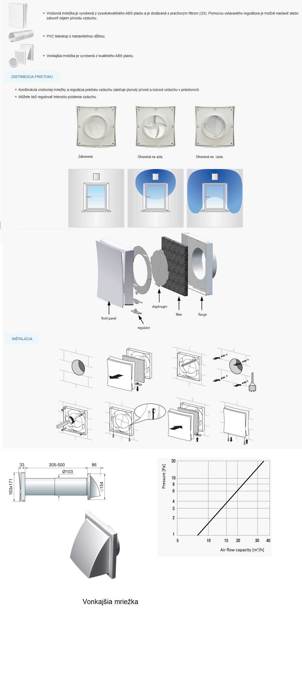 Vetracia jednotka PS 102 je sacia vetracia jednotka pre konštantné vetranie a určená na prívod čerstvého vzduchu do obytných alebo nebytových priestorov. Vetracia jednotka PS 102 môže naplniť miestnosť čerstvým vzduchom,nemusíte otvárať okná a púšťať do miestnosti prach, hluk z ulice. A tiež eliminuje únik tepla v zime cez otvorené okno alebo okenný prieduch, a tým znižuje náklady na dodatočné vykurovanie miestnosti. Môžete bezpečne opustiť miestnosť, tesne zatvoriť všetky okná a vetracie otvory, čo umožní, aby vetrací otvor v stene mohol vykonávať svoje funkcie počas vašej neprítomnosti. Nástenný prieduch je inštalovaný vo vonkajšej stene priestorov, chát, kancelárskych budov atď. Nad alebo v blízkosti okna. VLASTNOSTI Špeciálne navrhnutá konštrukcia vnútornej mriežky a regulácia prietoku vzduchu zaisťuje plynulý prívod vzduchu a jeho distribúciu. Hladké miešanie teplého a studeného vzduchu v zime zabraňuje nadmernej vlhkosti a zaisťuje samoreguláciu klímy v priestoroch. KONŠTRUKCIA A NÁVRH Nástenný prieduch pozostáva z 2 vetracích mriežok (vnútornej a vonkajšej) a teleskopického potrubia.
