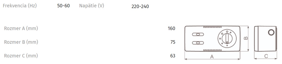 Prepínač rýchlostí 5-polohový pre ventilátory. Nástenná a podomietková inštalácia v štandardnej elektrickej krabici UNI 505. Biela farba. Jednofázové napájanie 220-240 V / 50-60 Hz Funkcie: On/Off/Auto (pre ovládanie ventilátora na externé senzory prostredia), Voľba rýchlosti (5 alternatív), Reverzácia smeru otáčania (odsávanie a dodávka), Prirodzené vetranie (ventilátor sa zastaví; klapky mriežky sa otvoria, čím sa umožní výmena vzduchu v miestnosti).